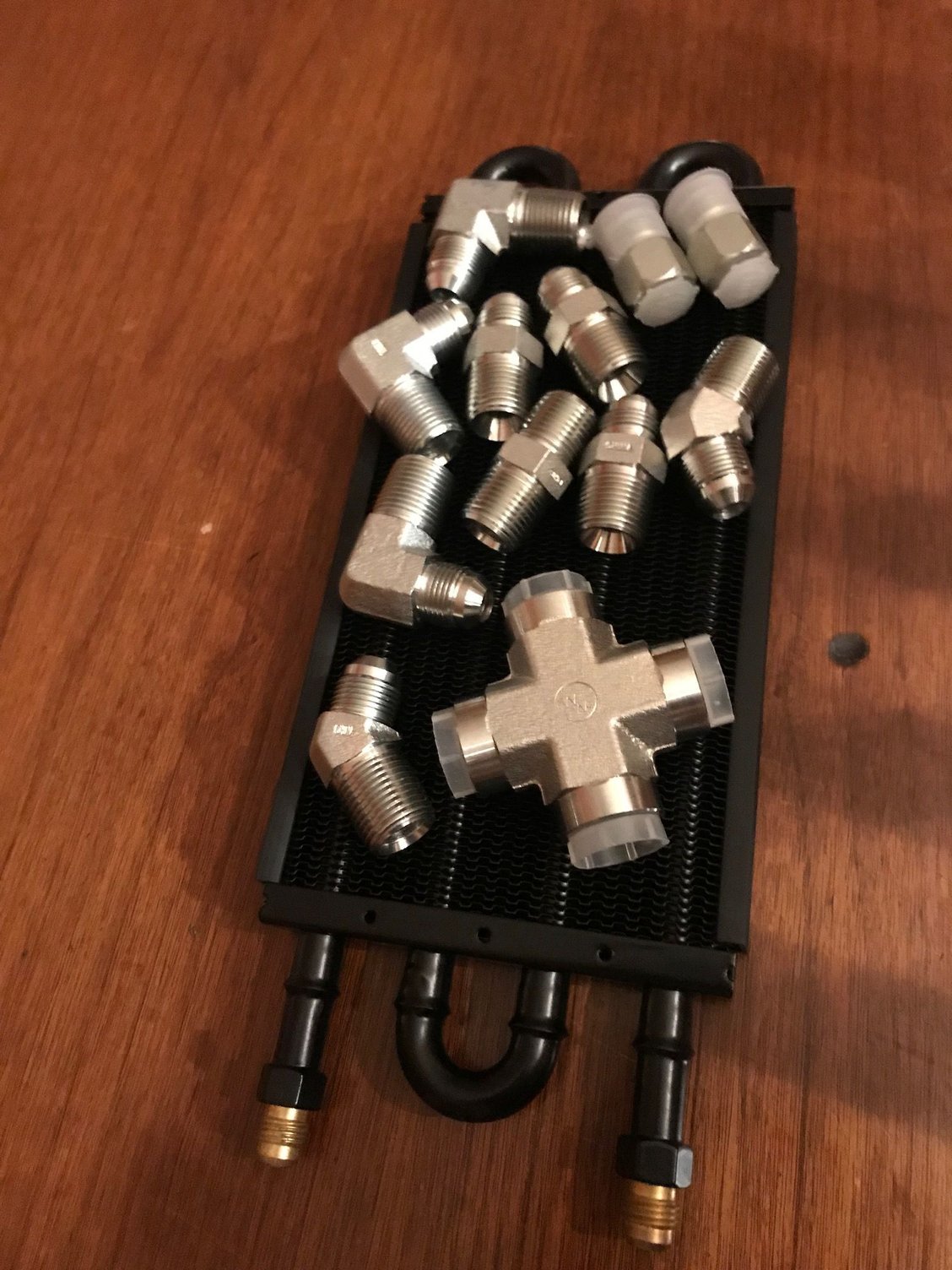 I have also been working on getting the engine ready to run. I will run a remote oil filter on the oil cooler circuit, so I have all that mostly set up. Just have to get some lines made with AN fittings. I still have to get the radiator set up, electric fans, power steering, fuel tank. So still a lot left to do.