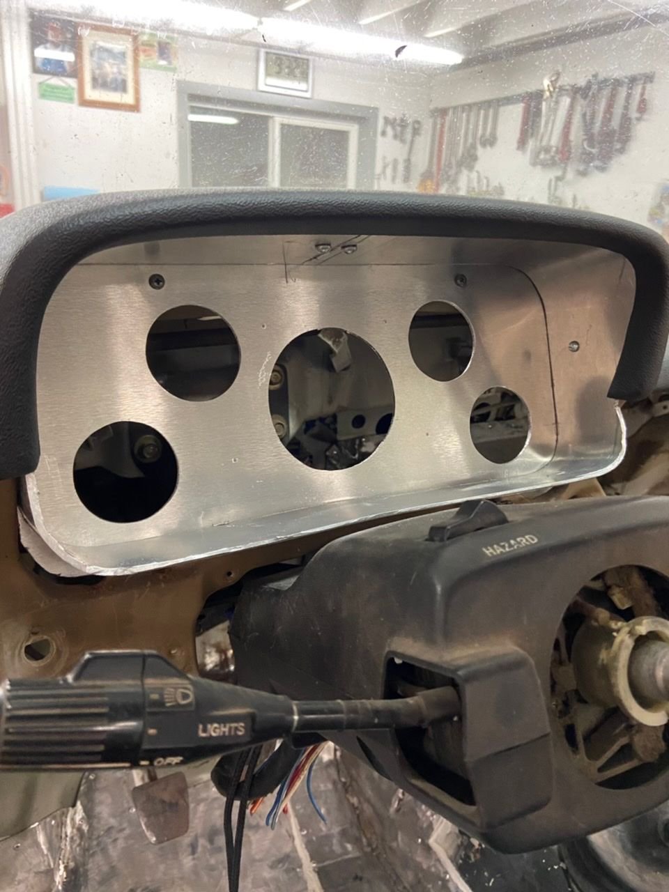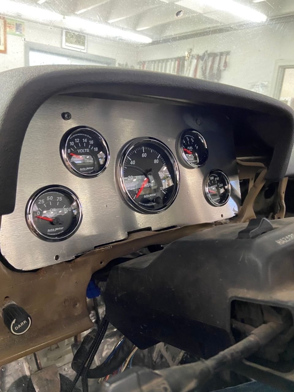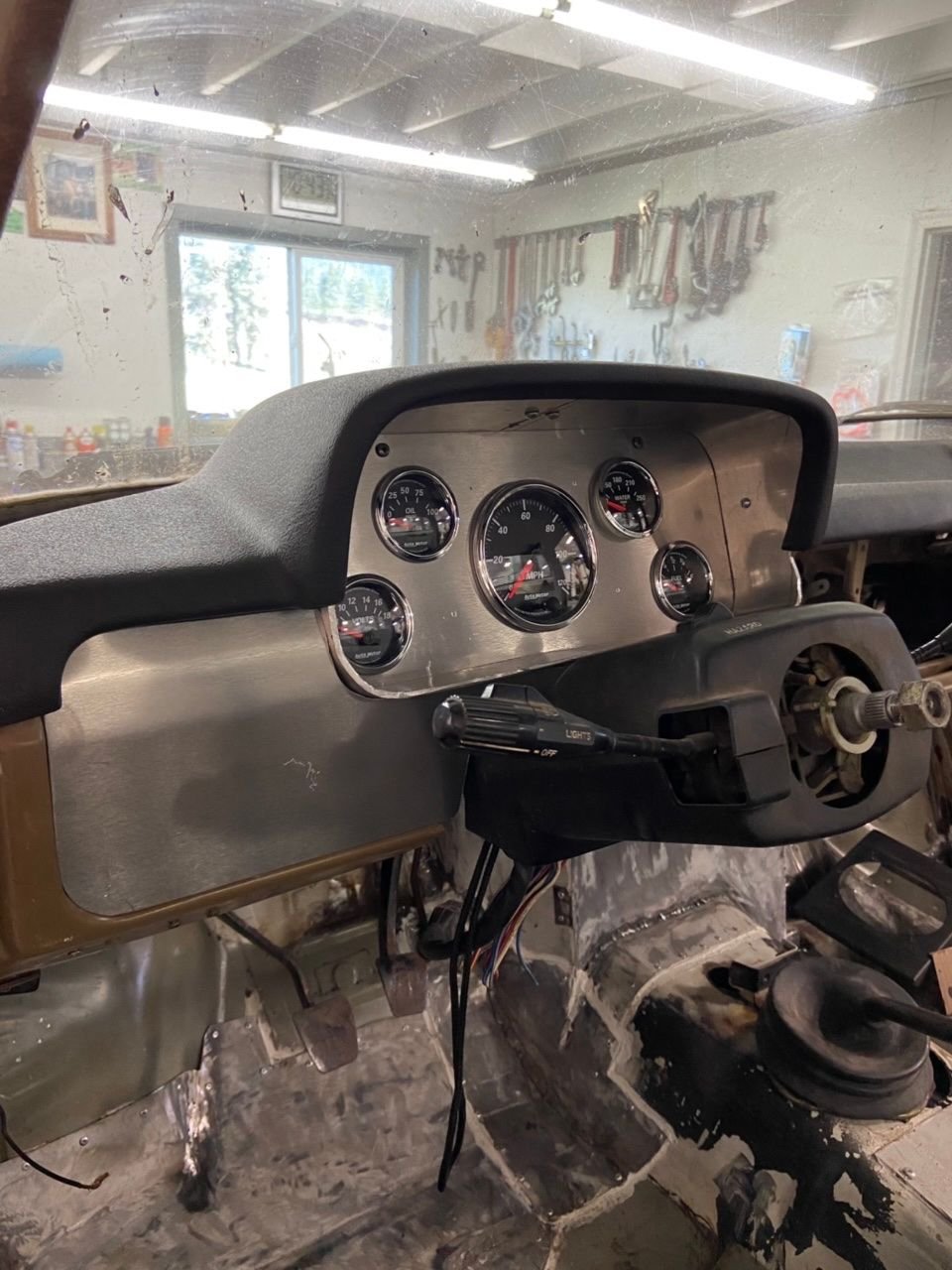 Been getting a fair amount done lately. Started her up for the first time about a month ago, the om617 ran great after sitting for a couple years. Among many other things, I raptorlined the bed, got the lights in, and have been making custom aluminum dash/gauge panel pieces. I really am excited about how it is starting to come together.
