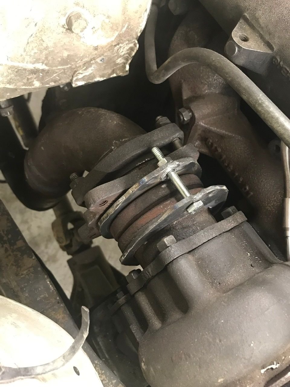 started working on my exhaust. The stock down pipe extended straight back off the turbo too far, it would have hit my firewall. So I made a little flange piece on each side of the exhaust so I can bolt it together and delete the intermediate piece. I have about an inch now between downpipe and firewall.