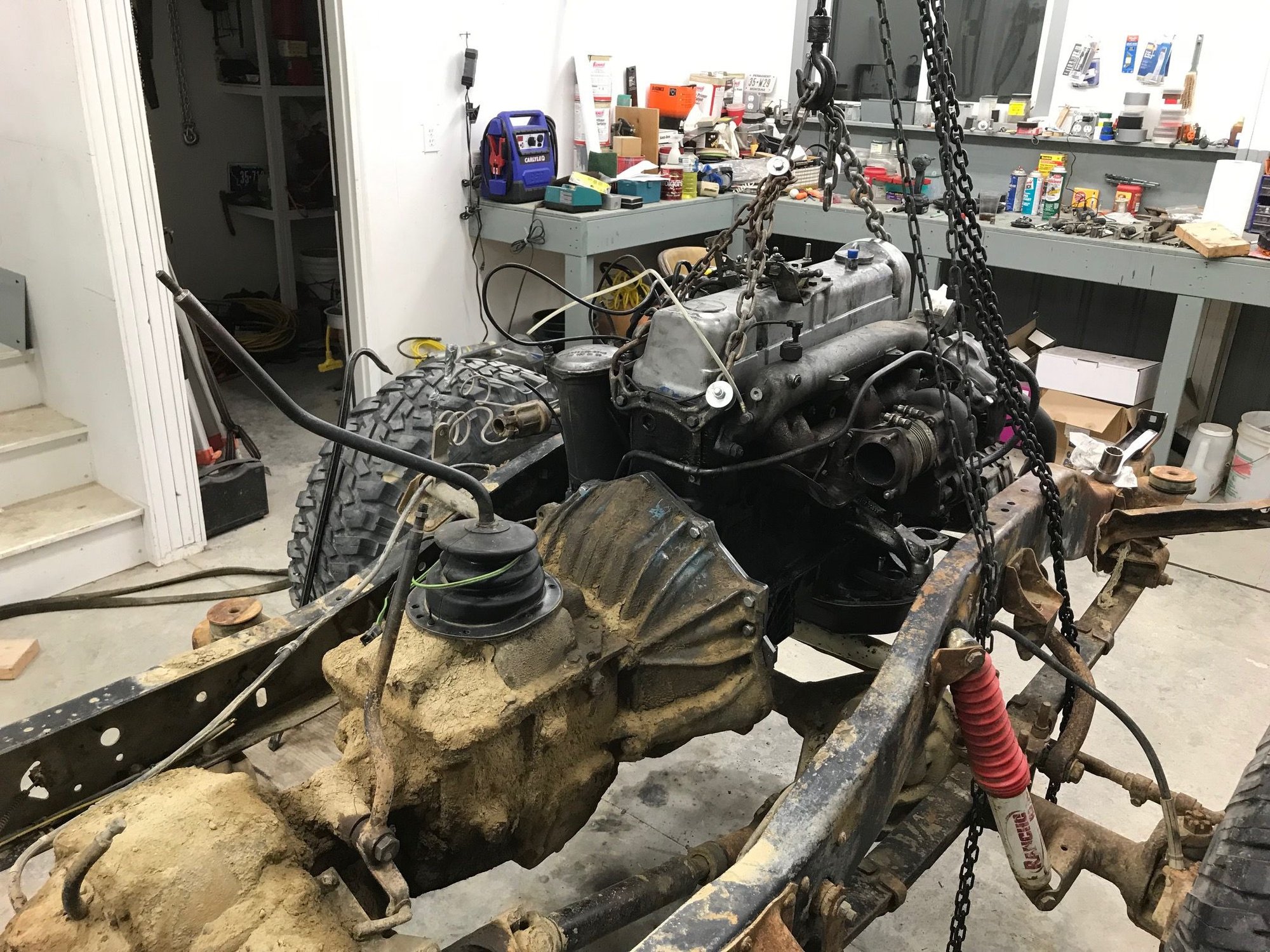 last week I pulled the cab and engine, hopefully one last time. While everything is apart, I have a ton of stuff to do. POR-15 the frame, ALDA delete on the injector pump, remote oil filter setup, bedline the flatbed frame, and put the clutch and flywheel in.