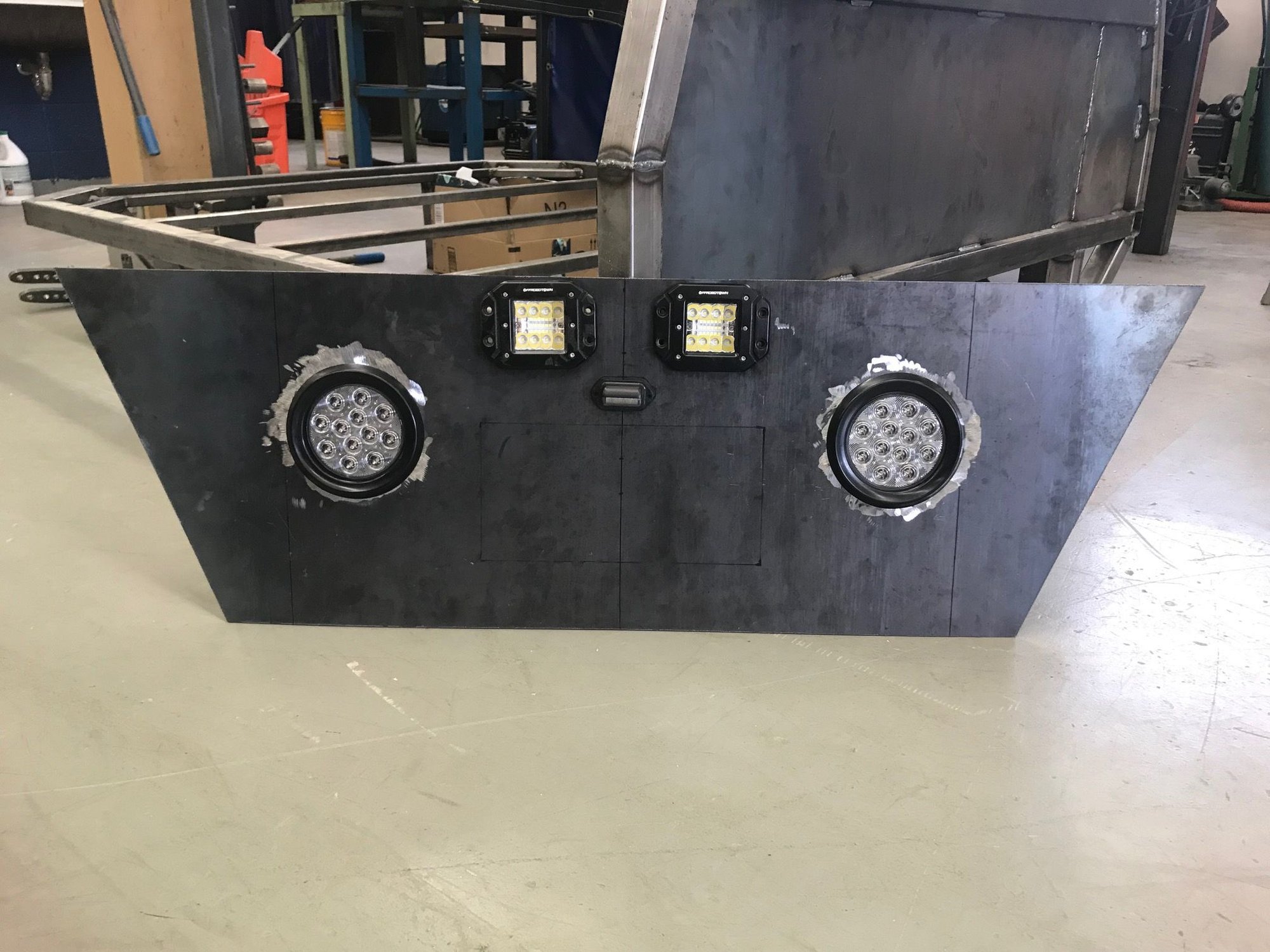 This is what the rear bumper will look like. Clear lens round LED taillights, LED pods for backup lights, plate in the middle.