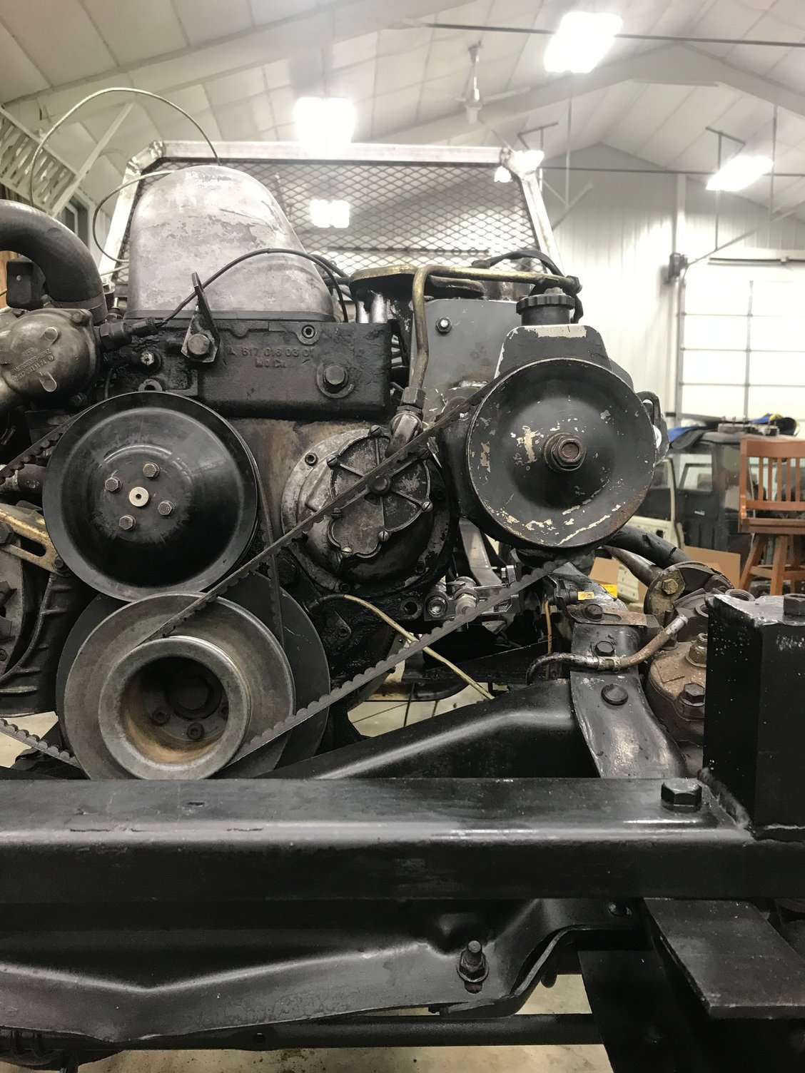 ive been getting the engine pretty close to running. Installed the starter (chevy starter), made a bracket for clutch slave cylinder, made a fully adjustable bracket to mount chevy PS pump on the om617. I also have the lower radiator mounts done. Diesel tank is also installed. I can upload more pics later.