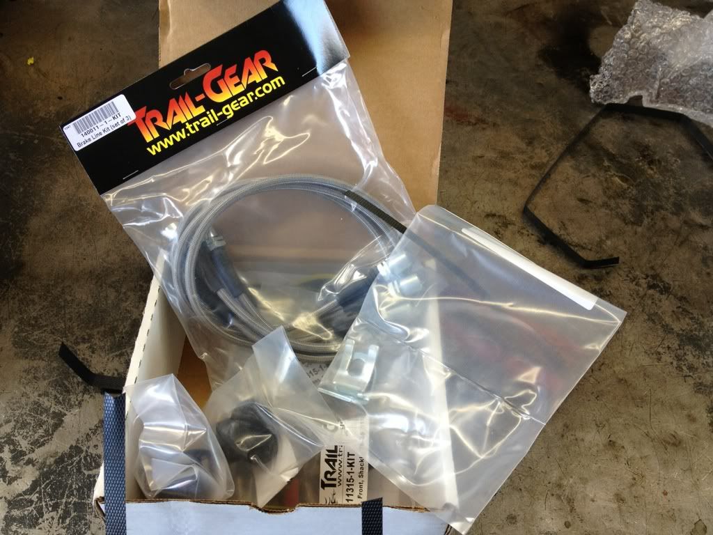 My trail gear loot came. Extended brake lines , extra line mount and clip , and 4 frame bushings for front shackles.