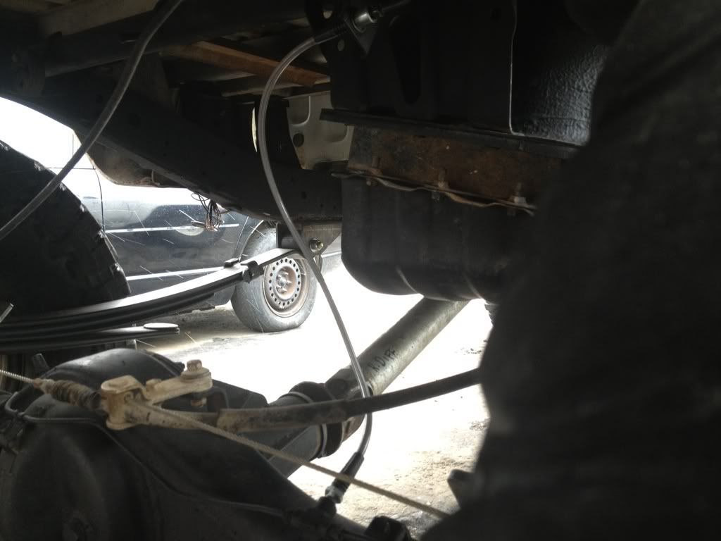 The ebrake cable mounts on stock rear spring hanger , since I put the 63s in and cut out the old hangers I had to weld a bolt to the gas skid plate and use a nut to mount the hanger so the cable wouldn't be flopping around.
