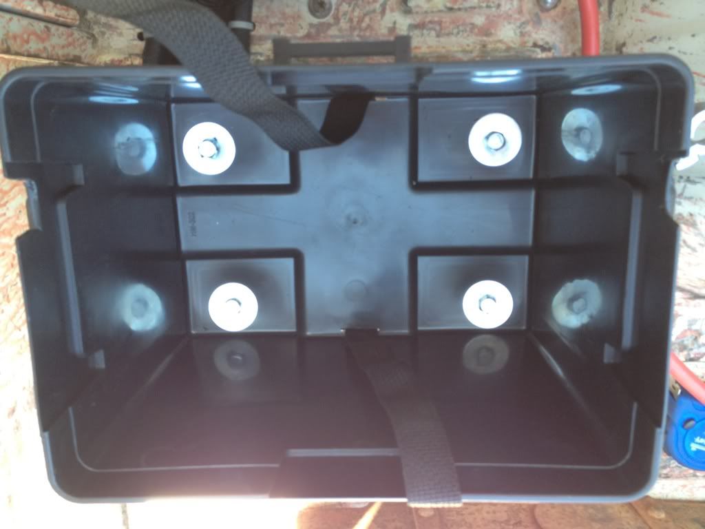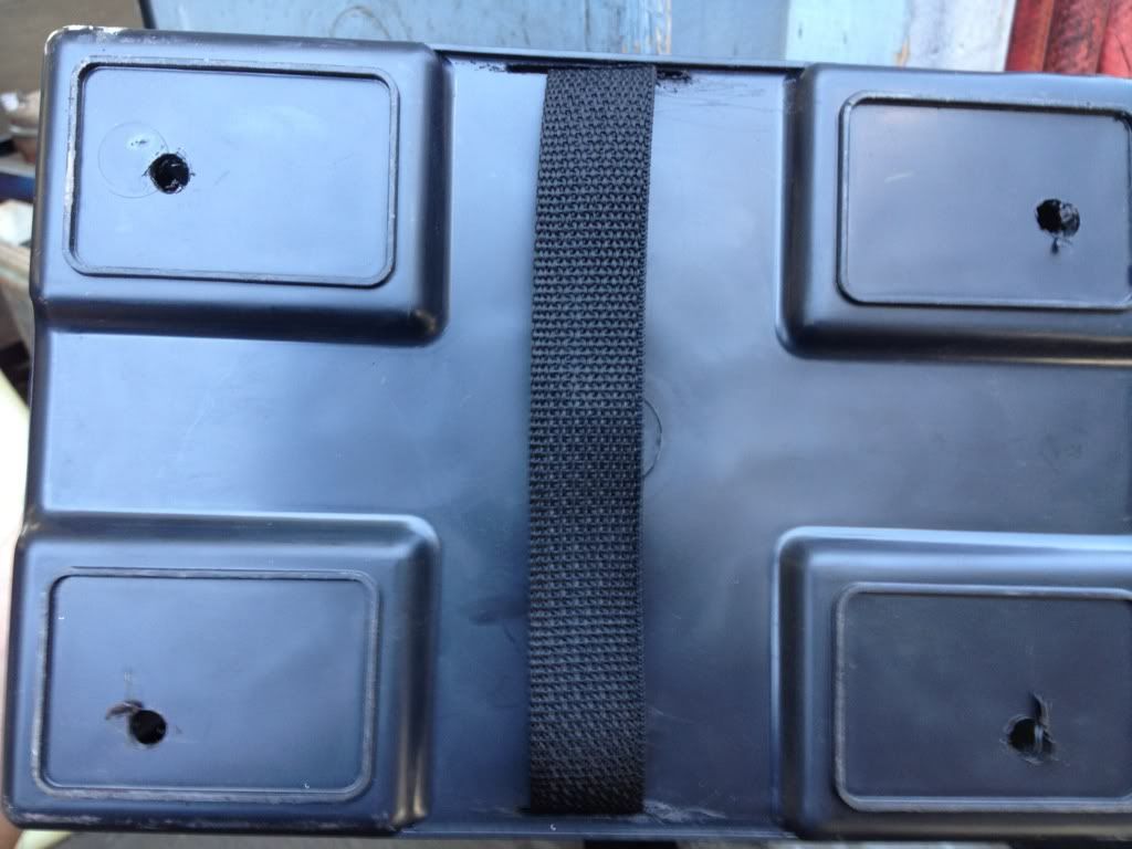 Then mocked up box in bed amd drilled 4 holes. Also I wanted to keep the battery from bouncing around in box so I took the cut off wheel amd made 2 slices to bottom of box to run a strap around to hold battery down inside.