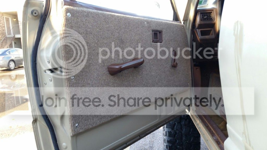 Door panels were kind of torn up, so i gave them a little makeover. Lined the inside of the door with some Peel 'n Seal from home depot to get rid of some of the road noise, then went with some MDF covered in indoor/outdoor carpet. I think it looks pretty good.