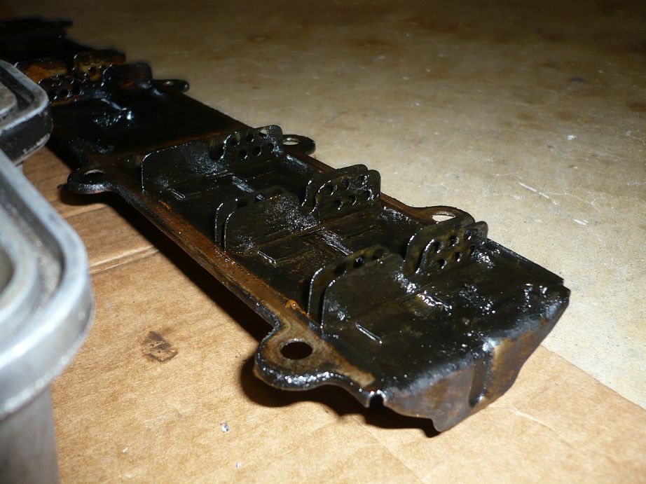 I also decided to remove the oil baffle from inside the valve cover to thoroughly clean out all the gunk that has collected there over the years. This required drilling the heads off the pressed in pins, removing the baffle, and then drilling out the remaining part of the pins. I am currently in the process of trying to tap the holes for bolts to remount the baffle with new gasket to the valve cover.