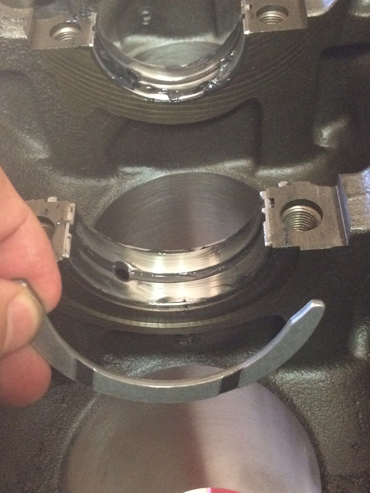 Install upper main bearings into block. make sure and insert bearings so that the "tang" lines up correctly with the tang groove in the bearing seat.