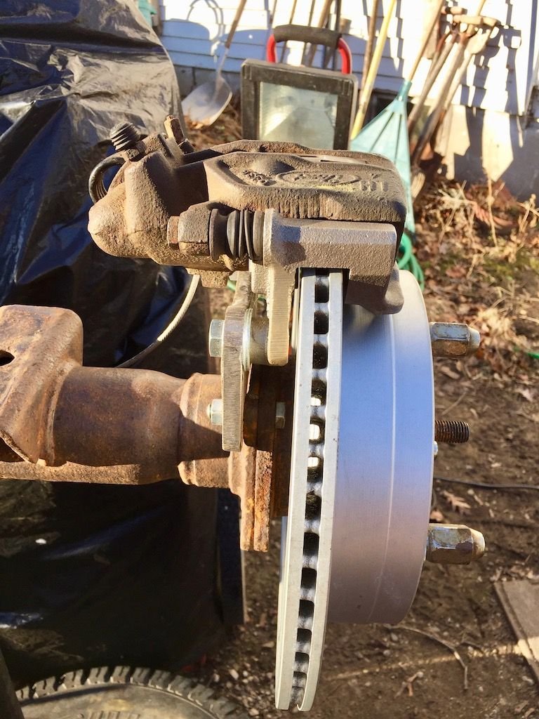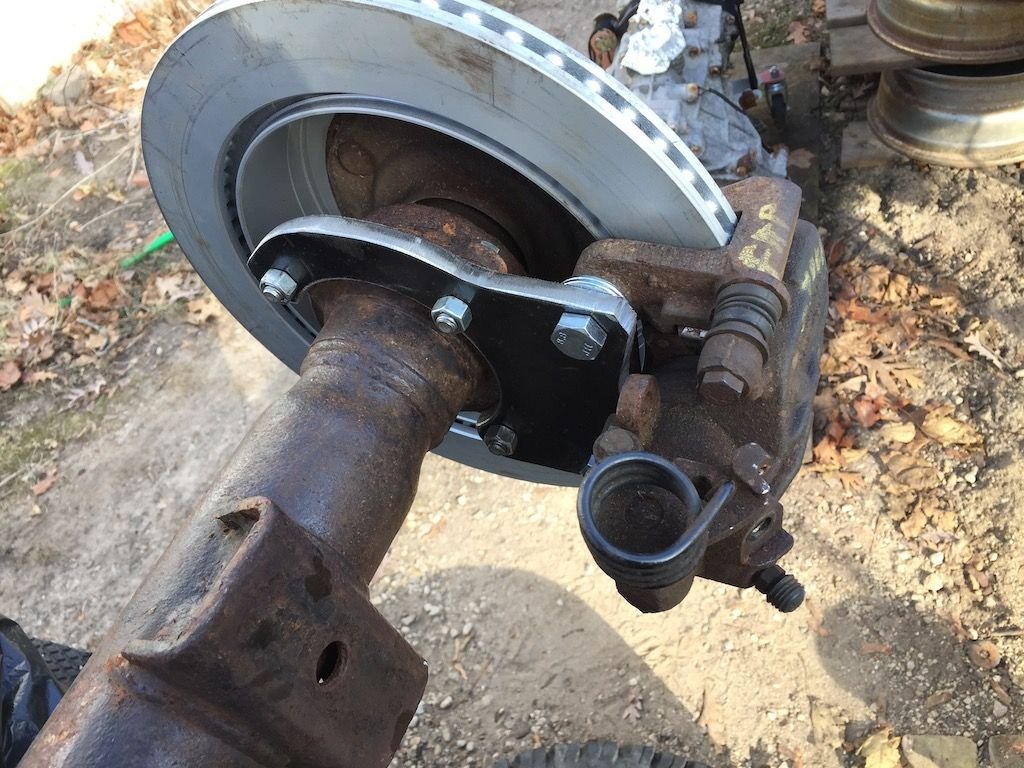 When you live in the rust belt it can be really difficult to keep the drum brakes on these old Toyota is in good working shape. One solution is to get rid of them entirely and replace them with a much simpler much more powerful disc brake set up. For years people have been using brackets made to mount up some old General Motors calipers and Chevy pick up truck rotors to replace the troublesome drum brake system. Unfortunately to make it work you have to get the rotors machined to clear the hub on the axle flange and you can’t get parking brakes unless you use some Cadillac Eldorado calipers with built-in p-brakes, which are getting more and more difficult to locate. And why not, they are made for vehicles that were introduced 40 years ago. I thought there must be a better solution. It turns out you can make a pretty good braking system by using fourth generation Toyota runner rear disks, which require no machining. For calipers you will want the rear calipers off of a 1998 to 2004 Mustang Cobra. These calibers have built-in parking brakes and are pretty plentiful and not too expensive at this time. Of course you will need some mounting brackets. I made mine out of some 3/8 steel. They don’t require any fancy bending to get the spacing right just one or two washers. Of course you will need some banjo fitting adapters for the hydraulic lines and you will have to do something to adapt the Toyota parking brake cables. I haven’t got that far yet, so I can’t provide an answer at this time. It looks like it will make a fine braking system and the volume of brake fluid needed to actuate these calipers is much less than the GM calipers and so I’m pretty sure that the Toyota master cylinder will be able to push enough brake fluid to make them work.