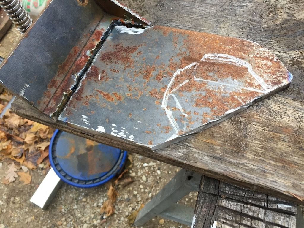 I have some new fenders for the runner, but before I took the old rusty ones off I thoughtI might play around with cutting the wheel openings for extra clearance and possibly to try to design some new fender flares. At first I used a pencil freehand to draw a line that I thought would be good, but once I had it cut I didn’t like it. It was too round. I thought a better design would be more faithful to the original shape of the fender which is flatter on top. So I went to my scrap pile and grabbed a piece of sheet metal and roughly cut it to shape and then attached it to the fender with some Cleco pins. Then, using the fender liner as a guide, I trimmed the new sheet metal addition to the new line. Now I have to figure out what kind of shape will work to make the fender wider, to provide some splash protection, and how to finish it out so that it looks aesthetically pleasing. Any recommendations or suggestions would be welcome, especially if they include drawings or pictures.