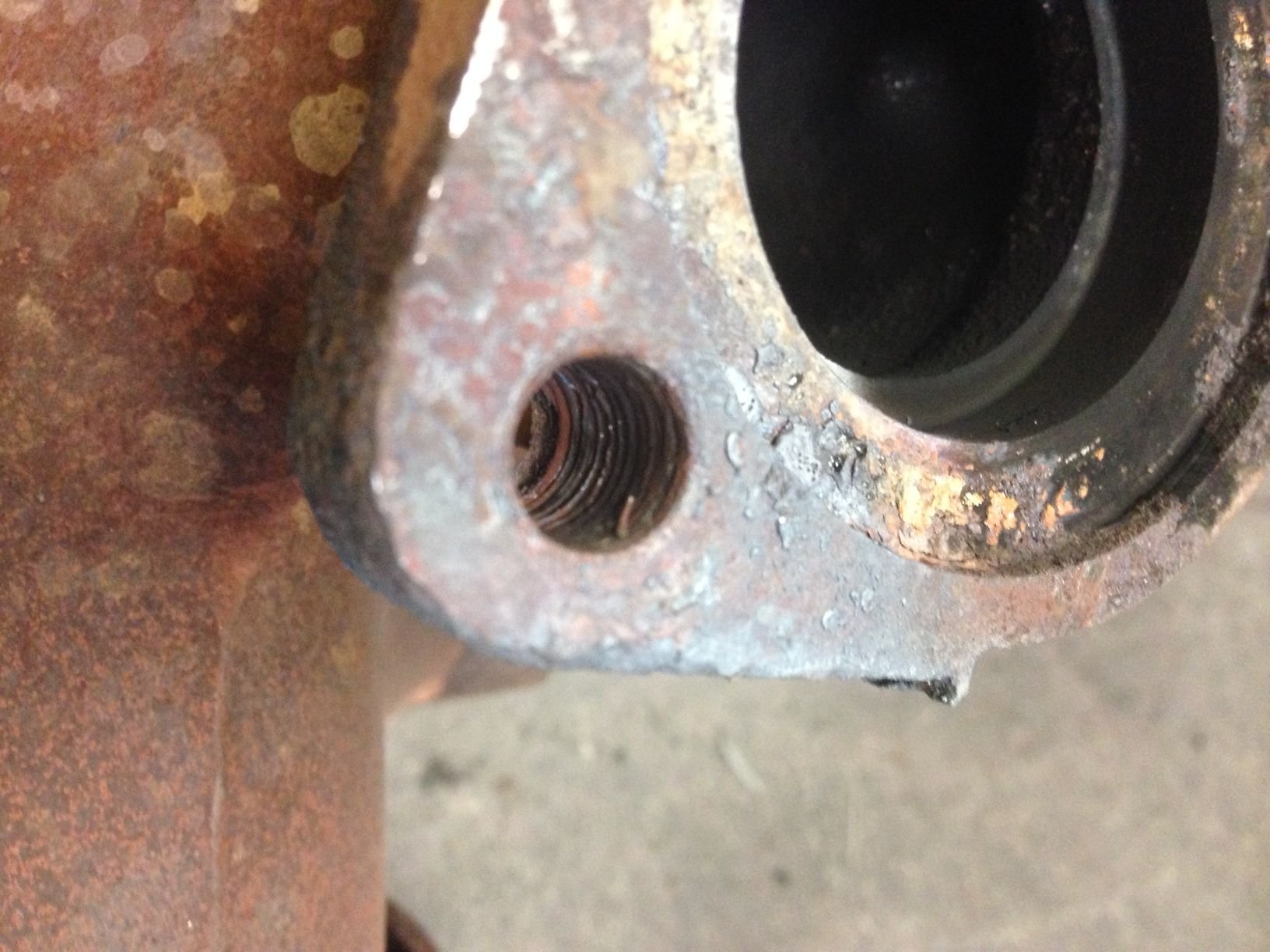 Well I got my timing chain and water pump on, that felt good. I also cleaned up a valve cover and got a new gasket. I really need to deal with my exhaust problem though. The studs that hold the pipe to the manifold were messed up, it got ugly when I tried to heat it up to remove and replace This is after I gave up on using this manifold. The stud that was already broke broke off even shorter, the other one came out but stripped the threads out on it and the manifold. At that point I did'nt even try the third, ill just have to use a different manifold I have that has good studs. here is the stud I actually got out of that thing, the threads in the manifold looked just as bad. At this point I removed the manifold, I almost had perfect success, but one bolt took all the aluminium with it. this is the nasty hole it left in my cylinder head. I am not yet dedicated to a plan yet, I'm going back and forth on using a helicoil, a time sert, or just re tapping and getting a bolt that will reach down to the threads in the bottom that were not damaged. That last option is probably the easiest. I did some very careful measuring, if I used a bottoming tap I can probably get almost the same thread engagement as the original(only short around 1 thread)