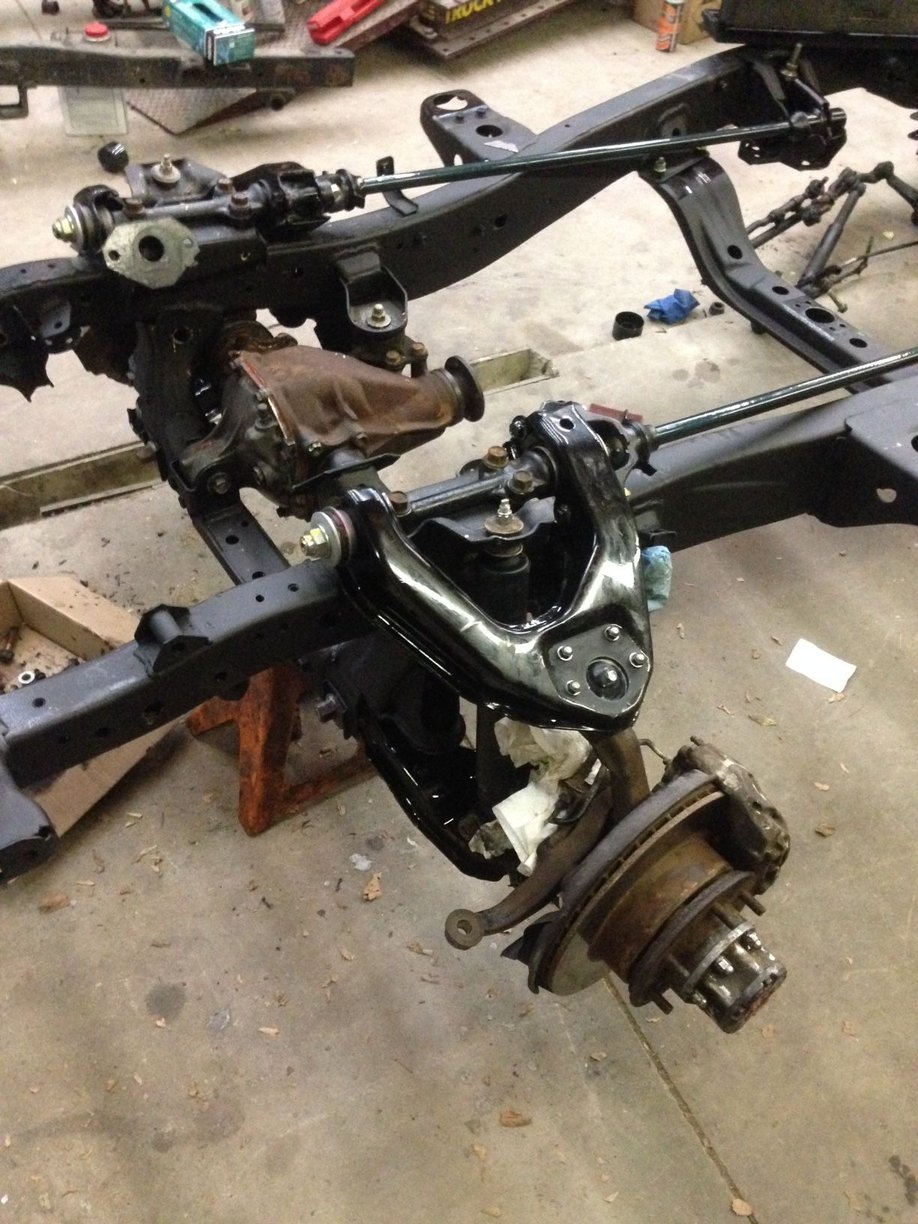 Thanks man! I'm pumped to get it back on the road! So i'm close to finishing assembly of my front suspension. I plan to get the chassis rolling and set the cab on the frame. Then weld the new front piece to the cab while all the body mounts are bolted to the frame. Then patch all the rust holes in the floor. Then take the cab back off to put the engine and trans in. Then put the cab back on for good and put everything back together. This will probably take me a couple months because i'm just doing it at night, and things are going to be pretty busy in the next month or so.