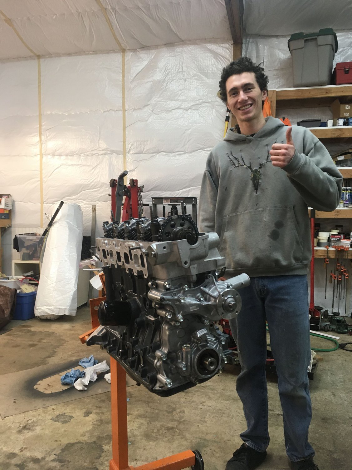 Chris with assembled long block. Chris wanted an "industrial look" so he painted it Chev gray (easier to spot oil leaks). Toyota gaskets all around. ARP bolts torqued to 75 ft-lbs.