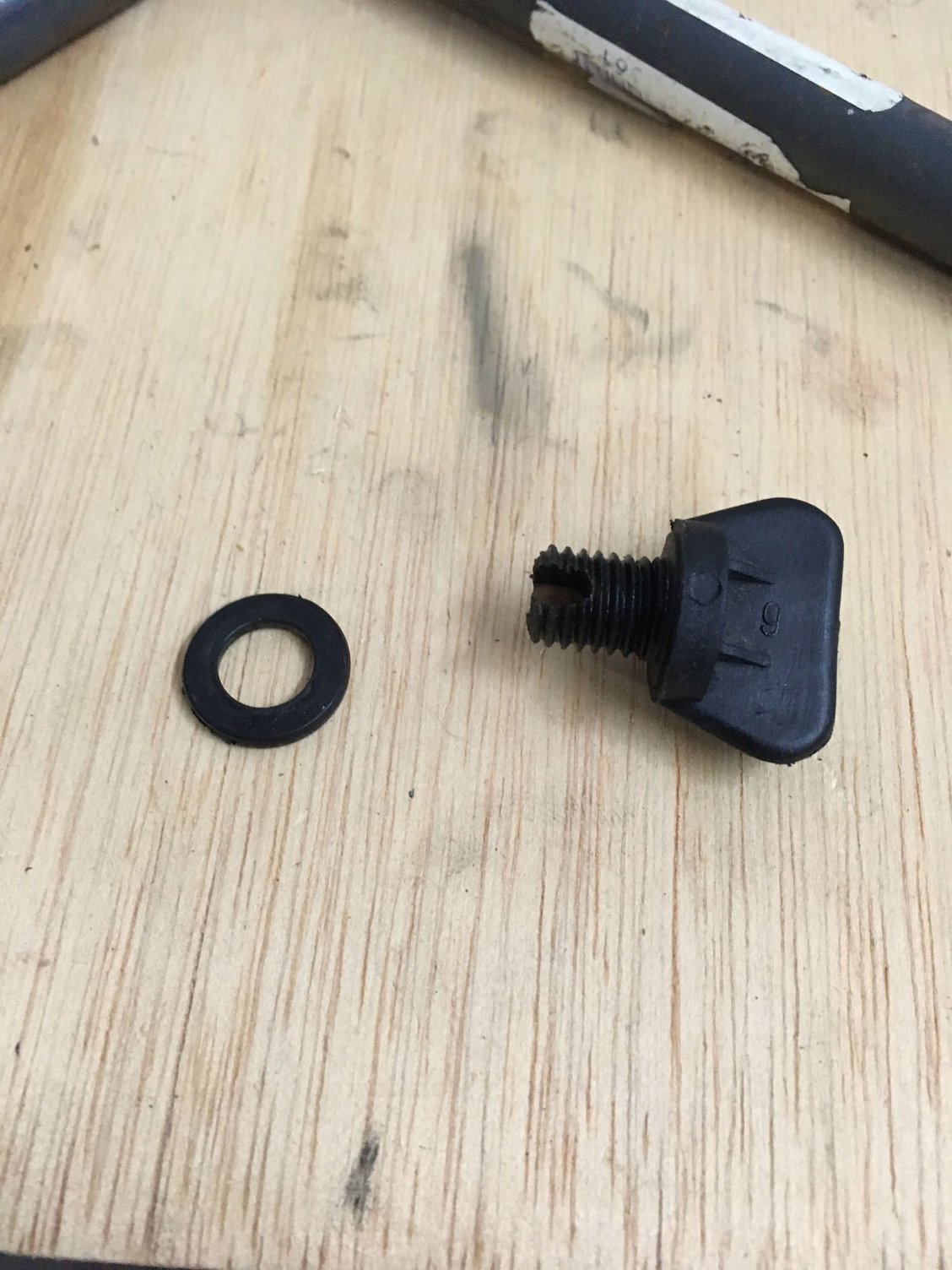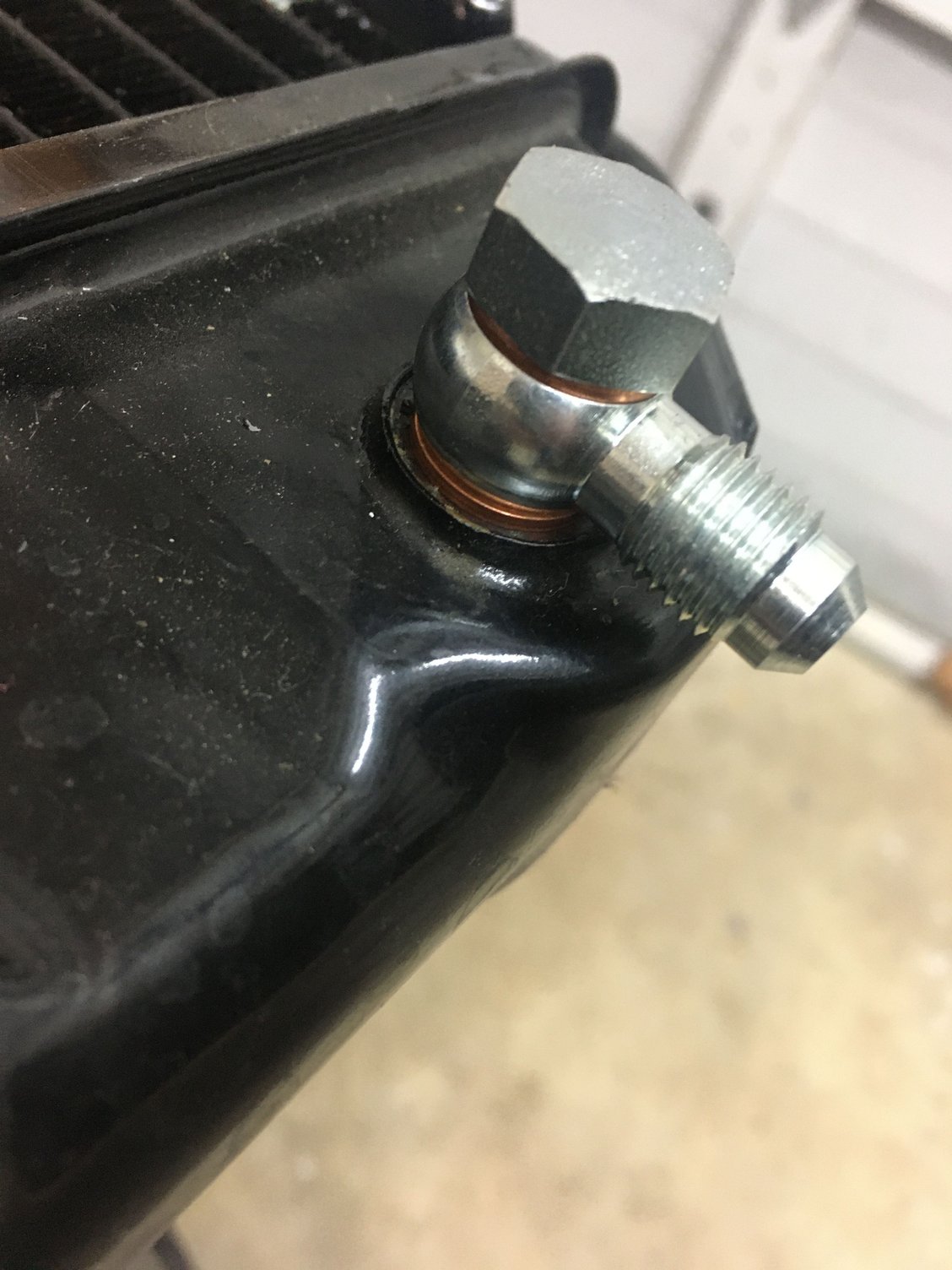 Fumoto did not make a size valve for the radiator, so Chris sourced a banjo bolt and bell. Not shown is the AN cap for this fitting. Draining radiator will be less messy now.