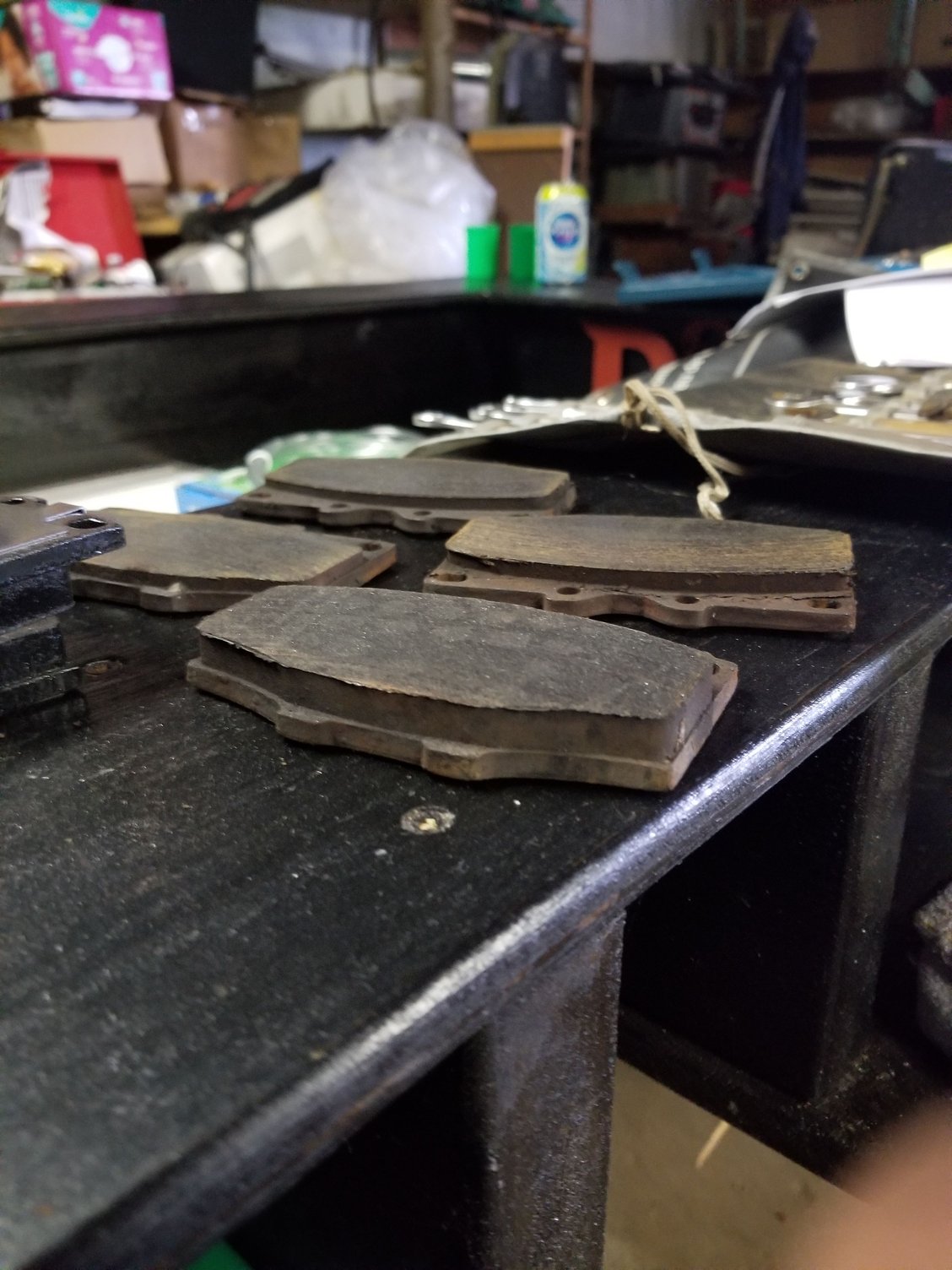 Here's my pads, as you can see, that first one was clearly not actuating properly, which is off the right(passenger side). Explains the pulling to the left(driver side) I was getting on hard braking. Other 3 pads are worn nice and evenly.