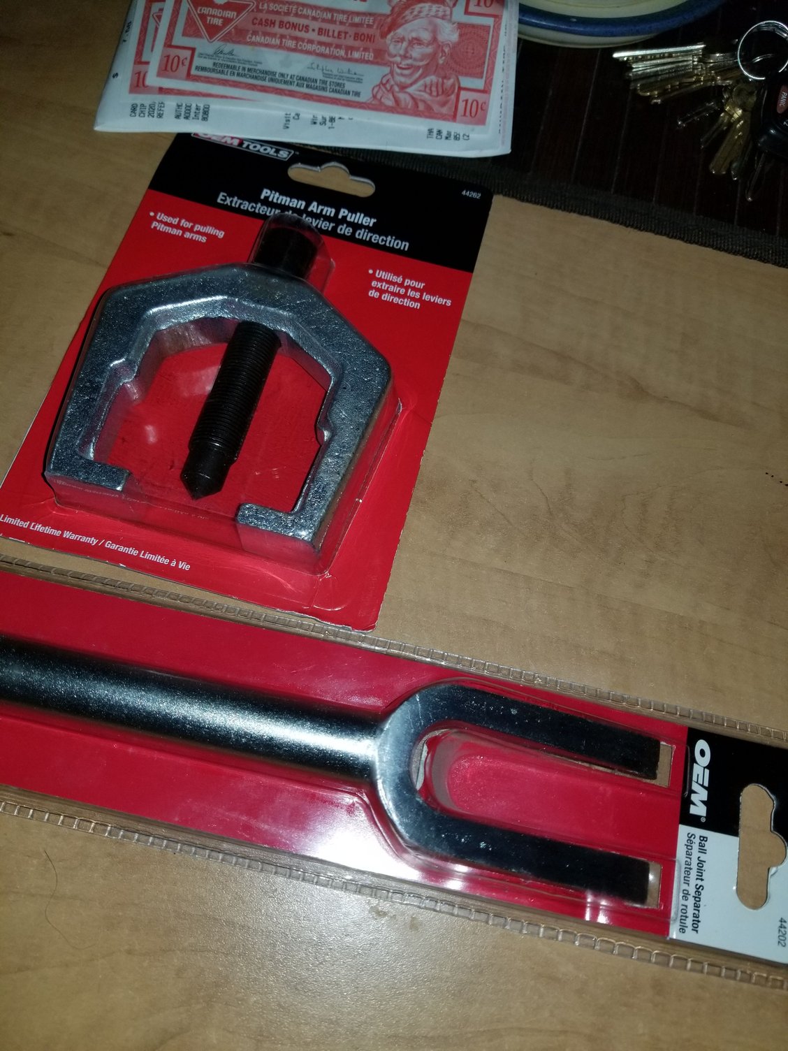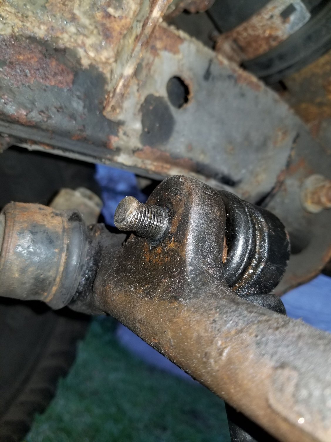 The troublesome bolt. I tried the ol' BFH method to start with.. didn't budge it, and even mushroomed the end of it slightly. Woops! Time to do some more research before wrecking anything else! Most write ups I found had the person successful with either a Pickle Fork/Ball Joint Seperator, or use a torch to heat it up, then apply the BFH. Found one post where a Pitman Arm Puller was suggested, and used successfully. Bought myself one of each! The Pitman Arm Puller was a little too bulky to get positioned properly, but the Pickle Fork Pickle Forked it right off! just a couple persuasions with the BFH and it popped right out.