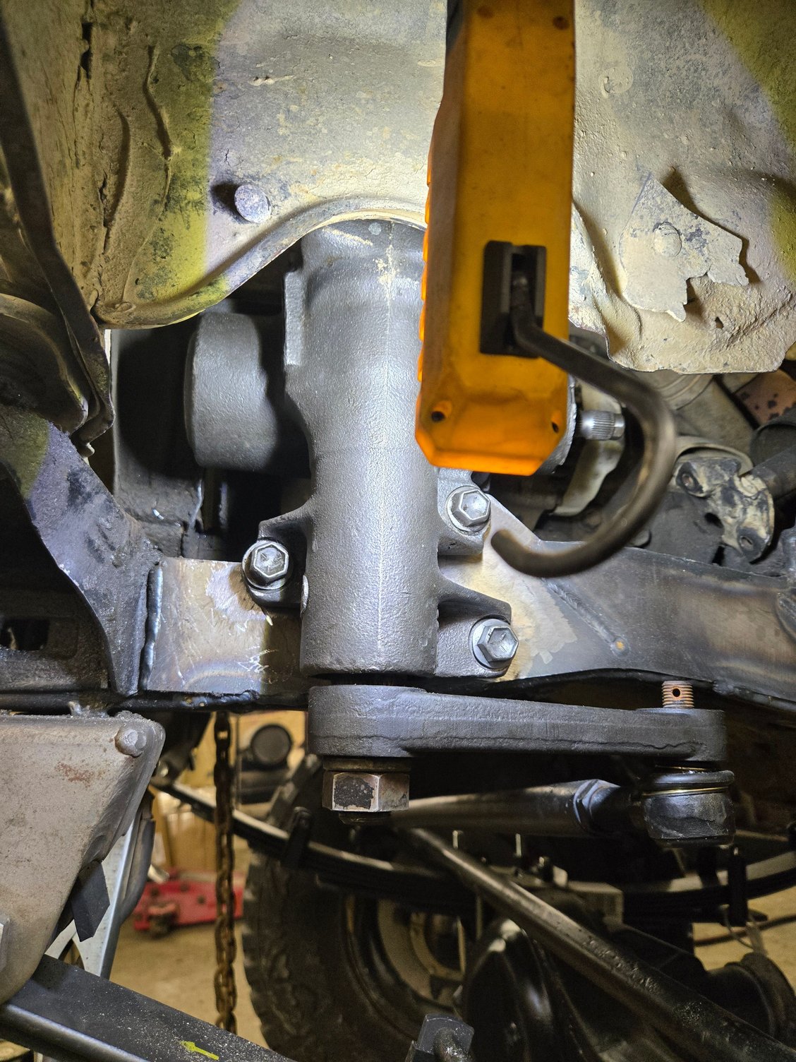 With that mocked up tine to move the steering box, pretty straight forward with a flat pitman arm (yes it does clear). Since I installed my hangers a bit further back then normal I was able to keep the box enough back that cutting into the core support or modifying the steering shaft was unnecessary.