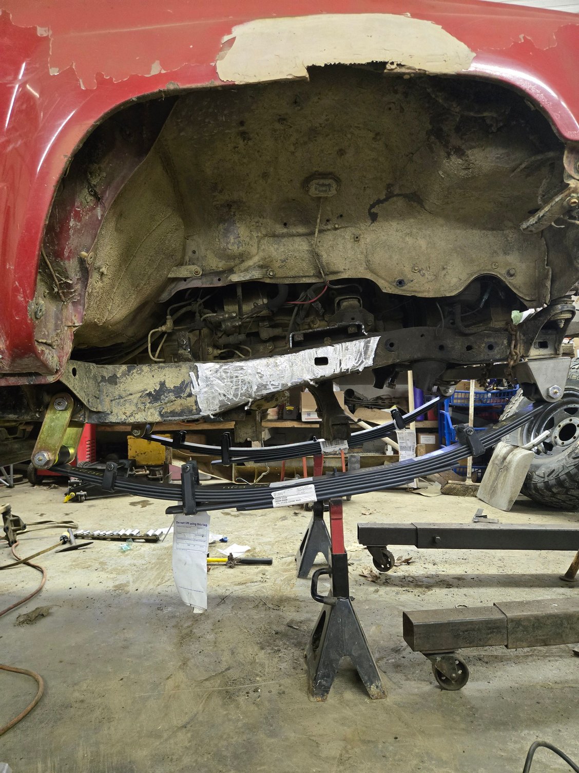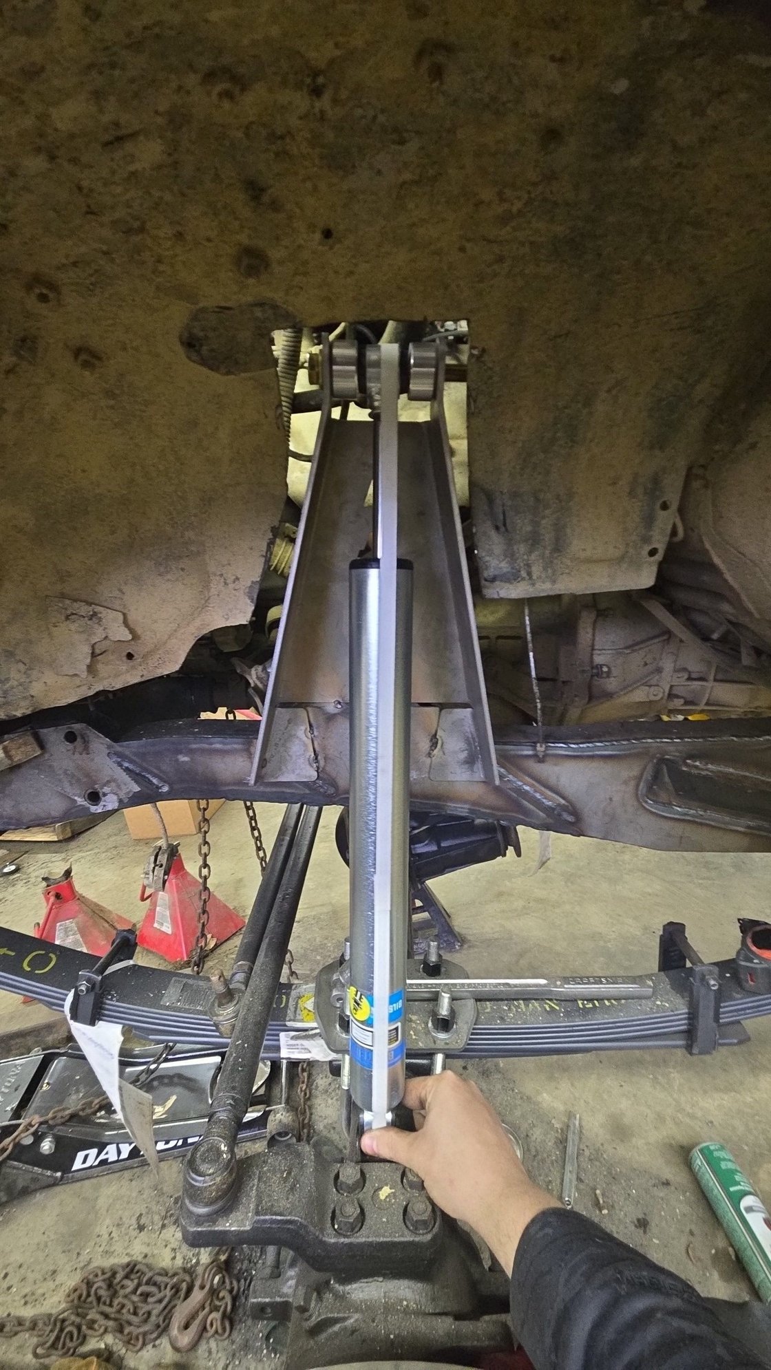 Mid 2018 after having a lot of trouble getting hi centered, I decided after a lot of research to go with some 63" chevy springs, I used the Low Range offroad kit, and some 2500 4wd springs (I think), I took one leaf out for a 3 leaf pack, I made my own adjustable upper shock mount and I designed and had my uncle cut out some lower brackets, and i got a crazy deal on some 12" travel bilstein 5100 series. I had to mount them / \ to have enough up and down travel without hitting the bed (flatbed probelms) so I designed and 3d printed some 3" spacers from nylon (Still holding up to this day) and did a cheap-o-depot 4" front ifs lift with blocks and a diff drop. 63" chevy leafs, 3" spacers on the bed, 4" front ifs lift (blocks and diff drop) and I know I'm missing a lug on the back, its fixed now.
