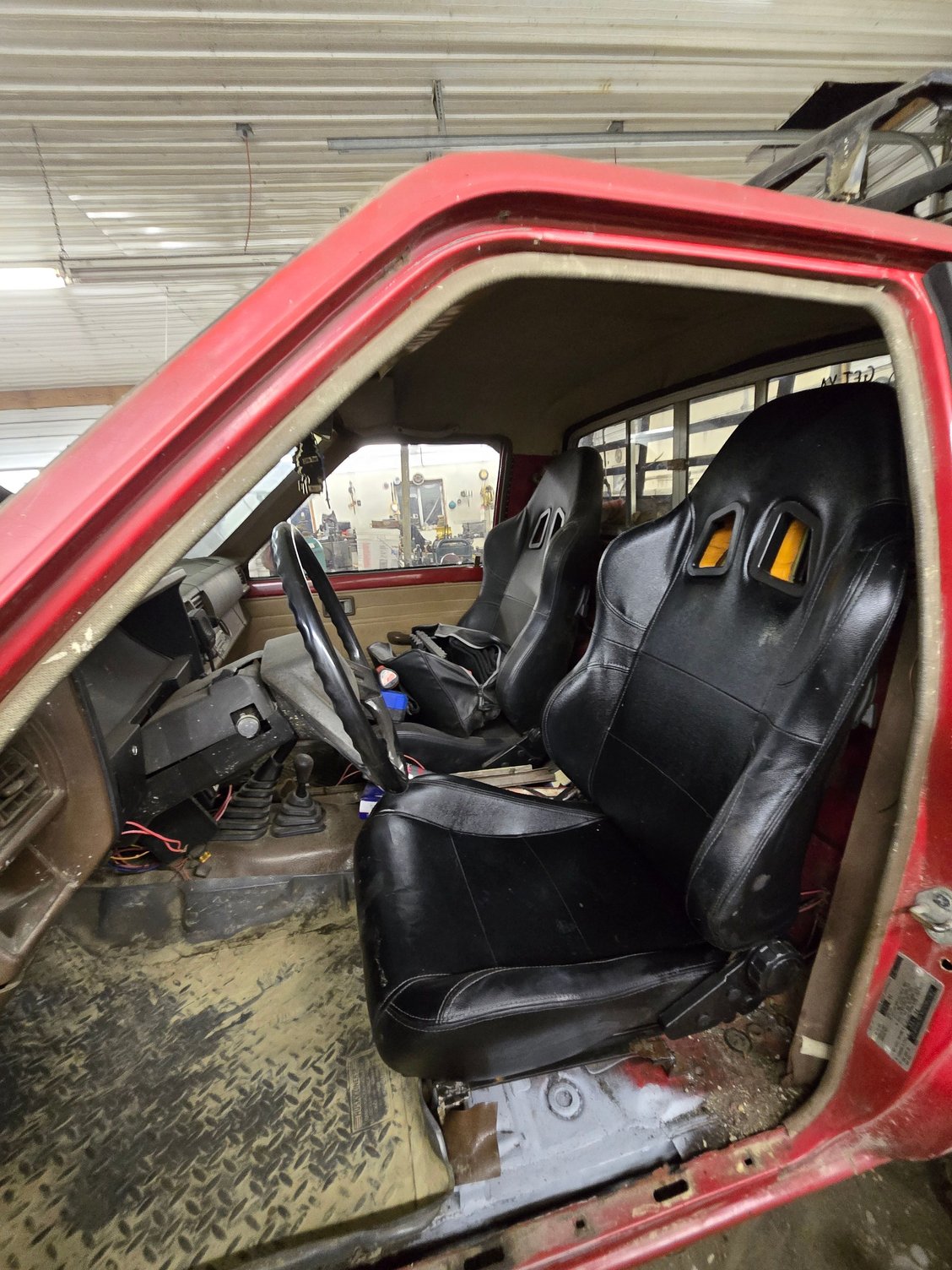 Ebay bucket seats I had laying around and some home made brackets, much more solid then my broken bench seat I've been sliding around on.