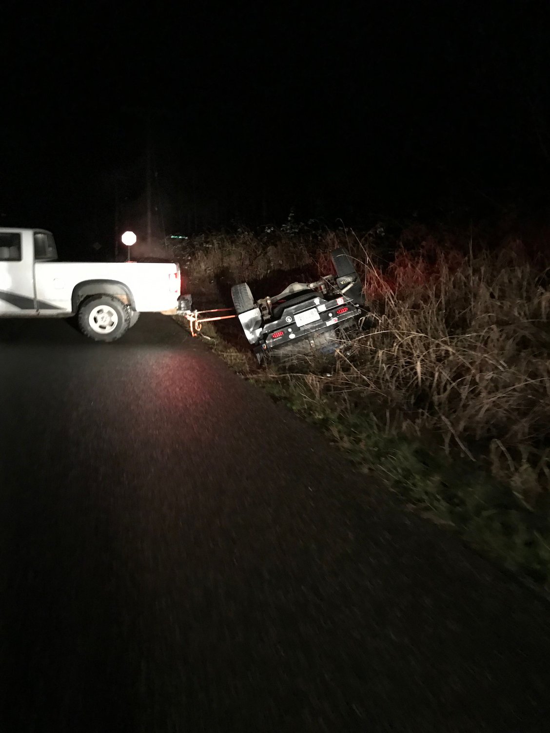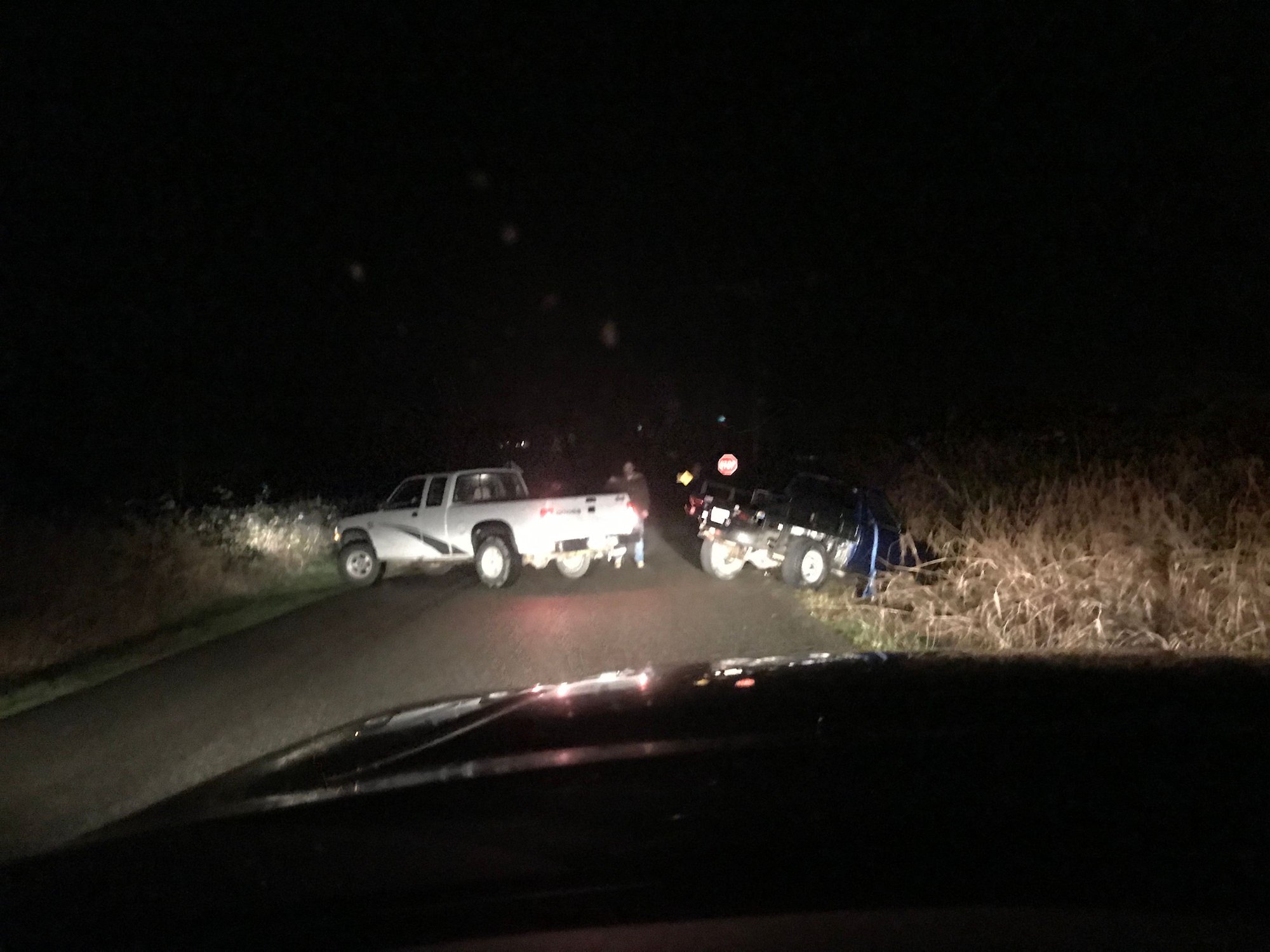 Well, I messed up. It was wet, I'd been drinking. I fishtailed around that corner, over corrected, caught the ditch with the driver corner of my truck and flipped straight over and landed in a flooded ditch. I couldn't get the doors open because I was pinched in the ditch and the cab was flooding fast, so I broke the driver door window and crawled out through the bushes. On the plus side we got to watch lots of fireworks while flipping the truck back over. but we wrecked the passenger side doing it. That glass is broken now too.