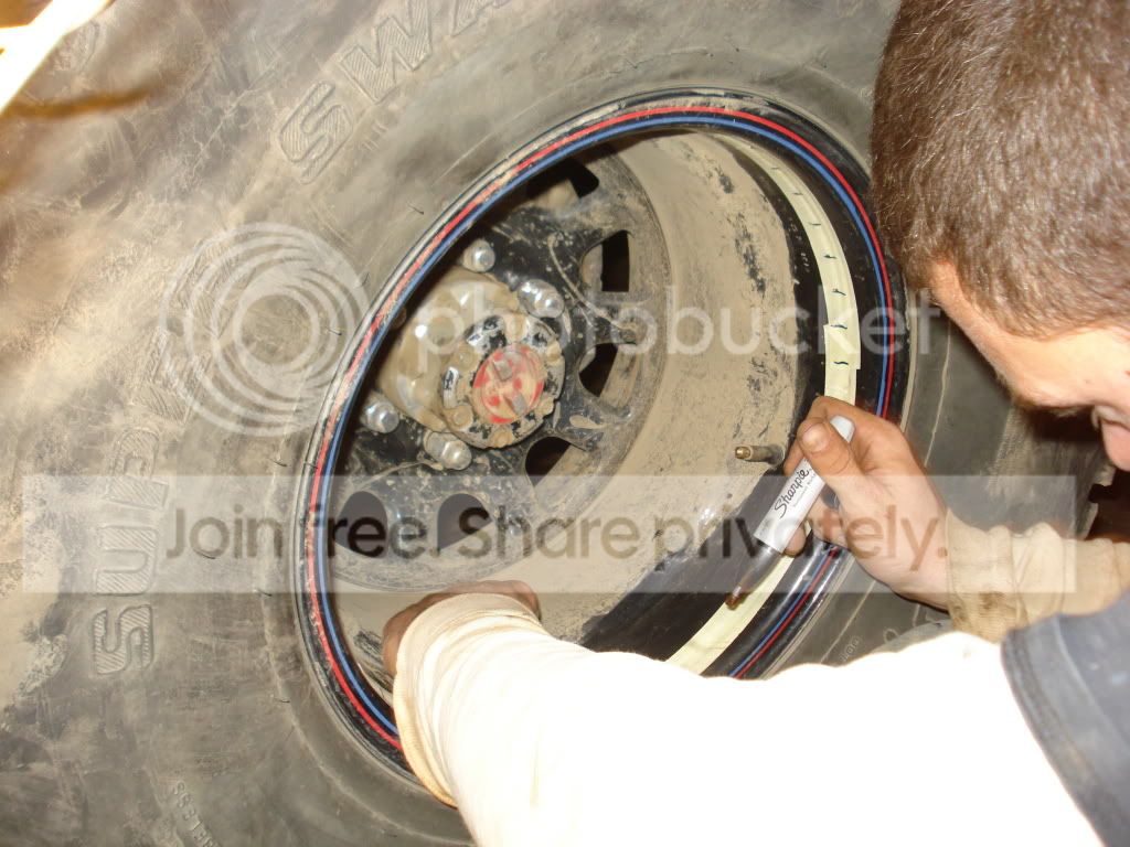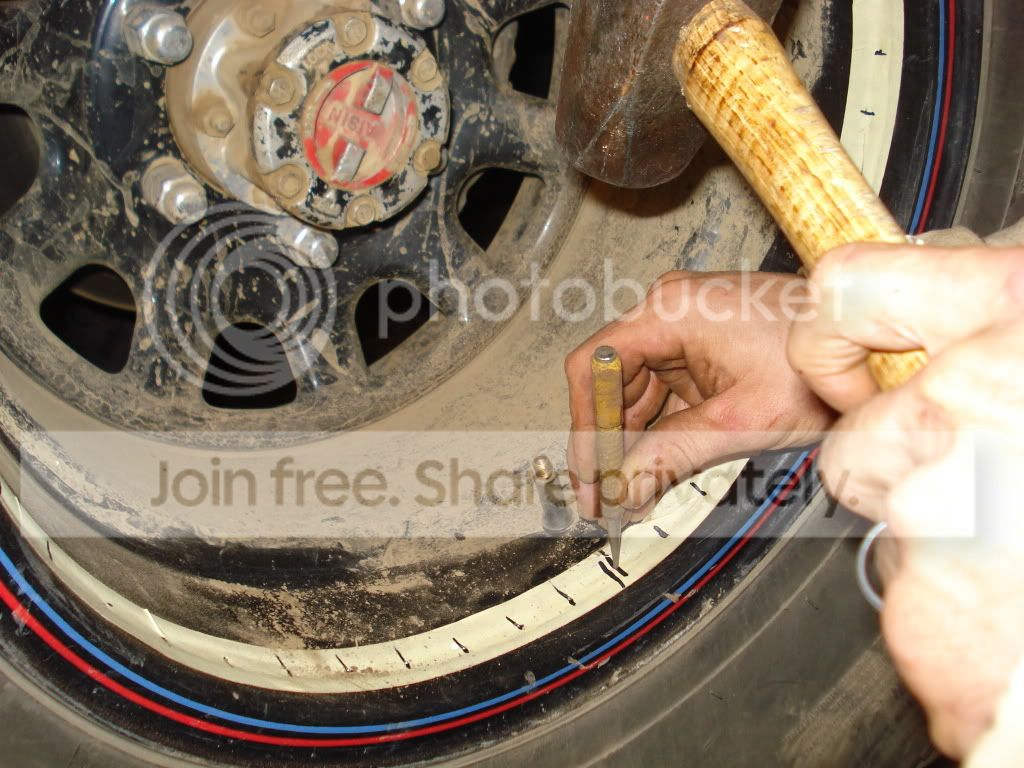 First pull the valve stems and let the air out of the tires.. Then jack the wheel up so you can spin it around to make the installment go smoother.. (oh better grab a few :beer: before you start, youll be here a while)