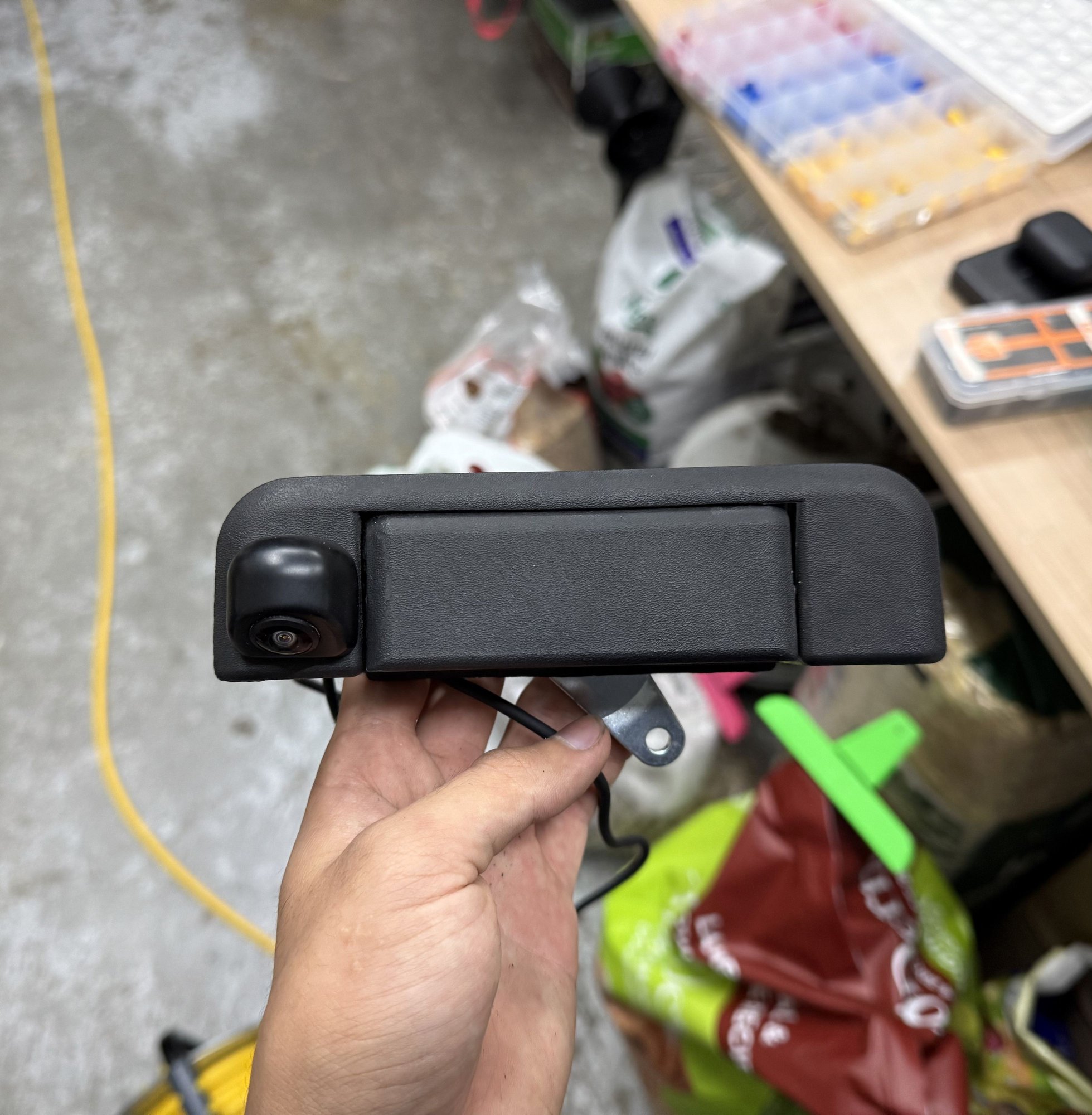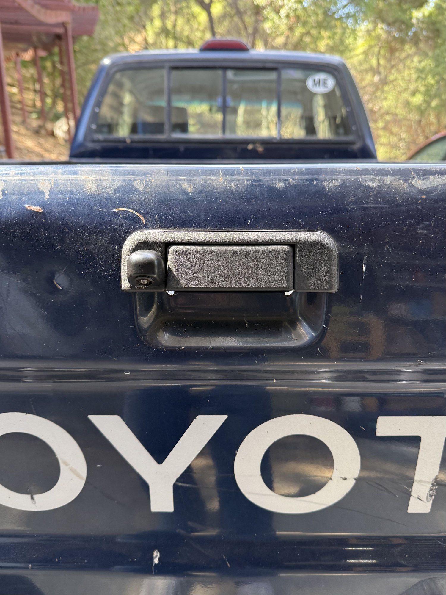 Now, I'll transition to my main part of the project: adding a backup camera. Of course, you'll need to make sure you have a digital headunit installed and have a backup camera on hand that is compatible with the headunit. Also, as a quick note (as maybe I'm just stupid) but at this point make sure you've kept the wiring exposed and the carpet slightly peeled back still. You still need to run the signal wire for the backup camera from inside the cabin to the rear. Other than this, everything is mainly preference. A quick bit of wire loom and some metal wire to help feed your wire loom and signal wire combo along the chassis to the rear and you're golden; you can just wire a cheap little backup camera that attaches to the license plate OR you can be a masochist and wire one directly into your tailgate handle like I did to get a "stock" look that comes with the modern Tacomas and Tundras. The end result will look something like this: