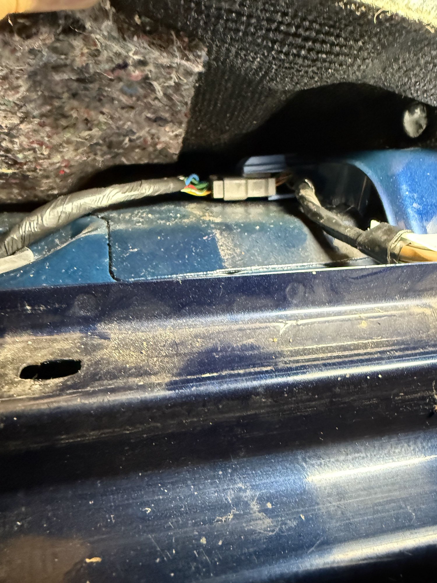 Now, if you look under the carpet carefully enough, there'll be a wire harness and male/female connector setup. There's a plastic clip holding the harness to the metal frame; use a long flathead to gently pry under the tab so that you can pull the wires closer to you (for easy access). This will look like: