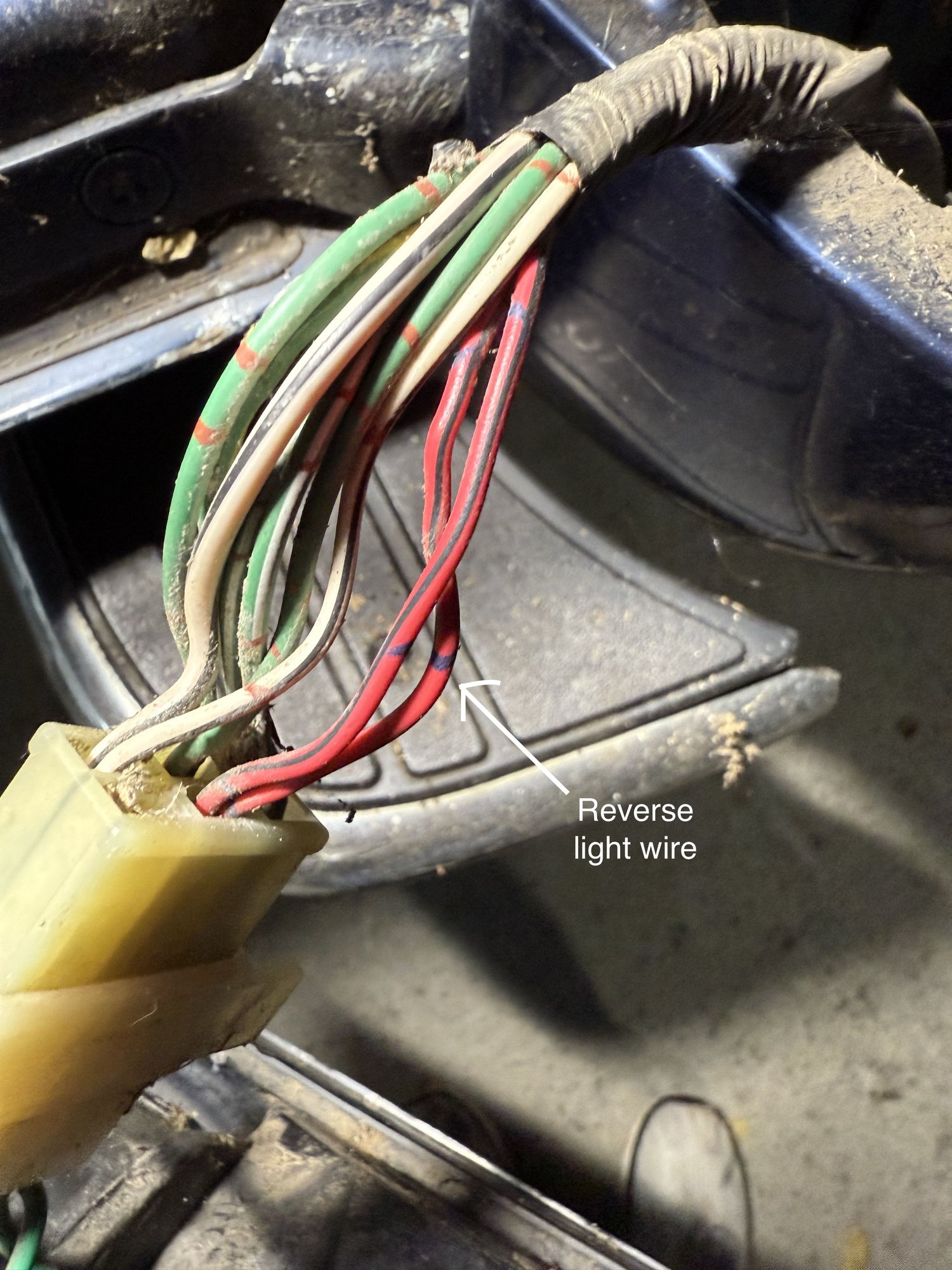 To start, if you take off the rear light assemblies, you can see that the power for the reverse light comes from a wire that is primarily red with both black stripes running along the length of the wire and purple (or blue? I'm slightly colorblind) blotches of color periodically appearing on it. Here's a picture of the wire in question: