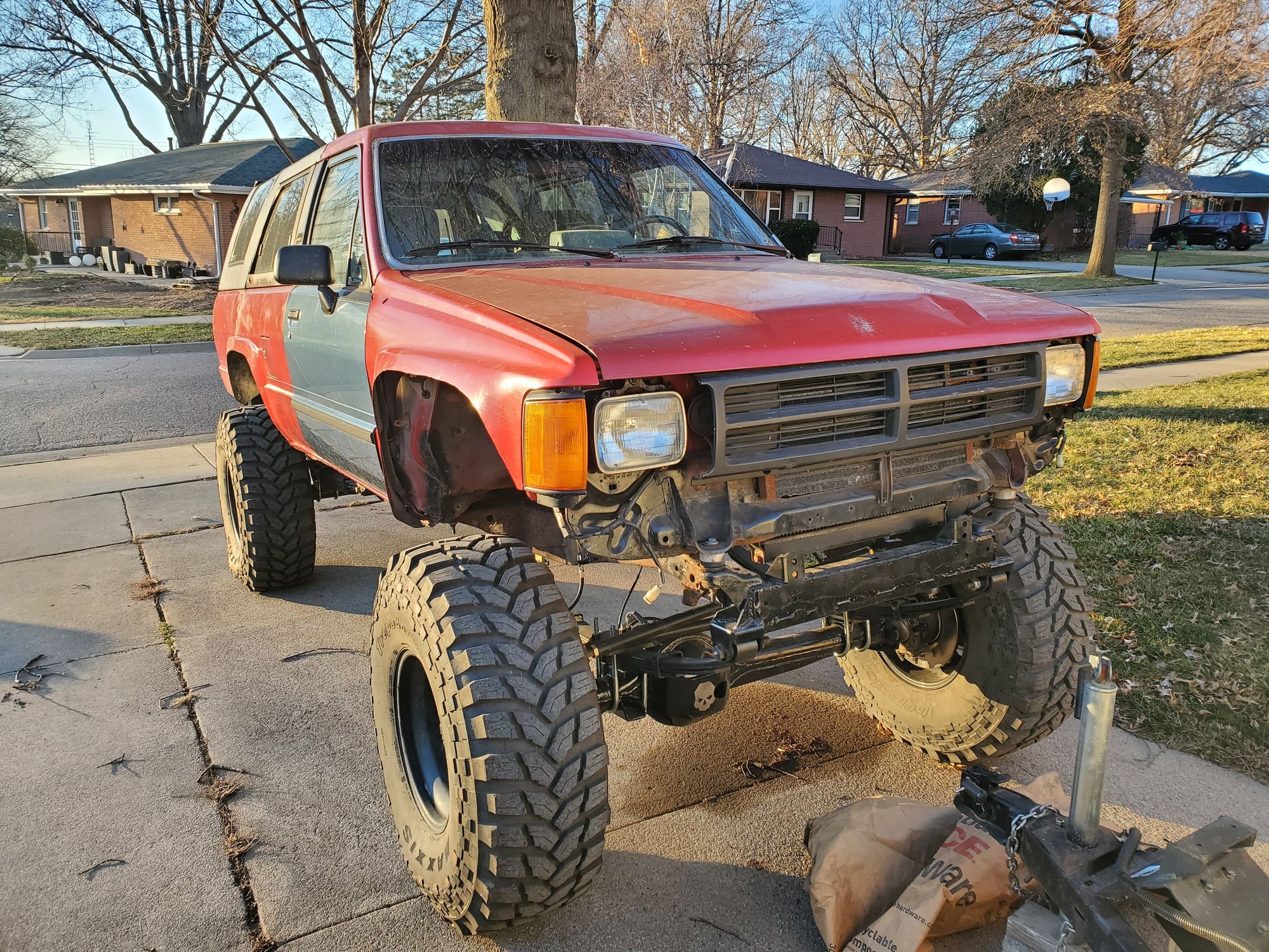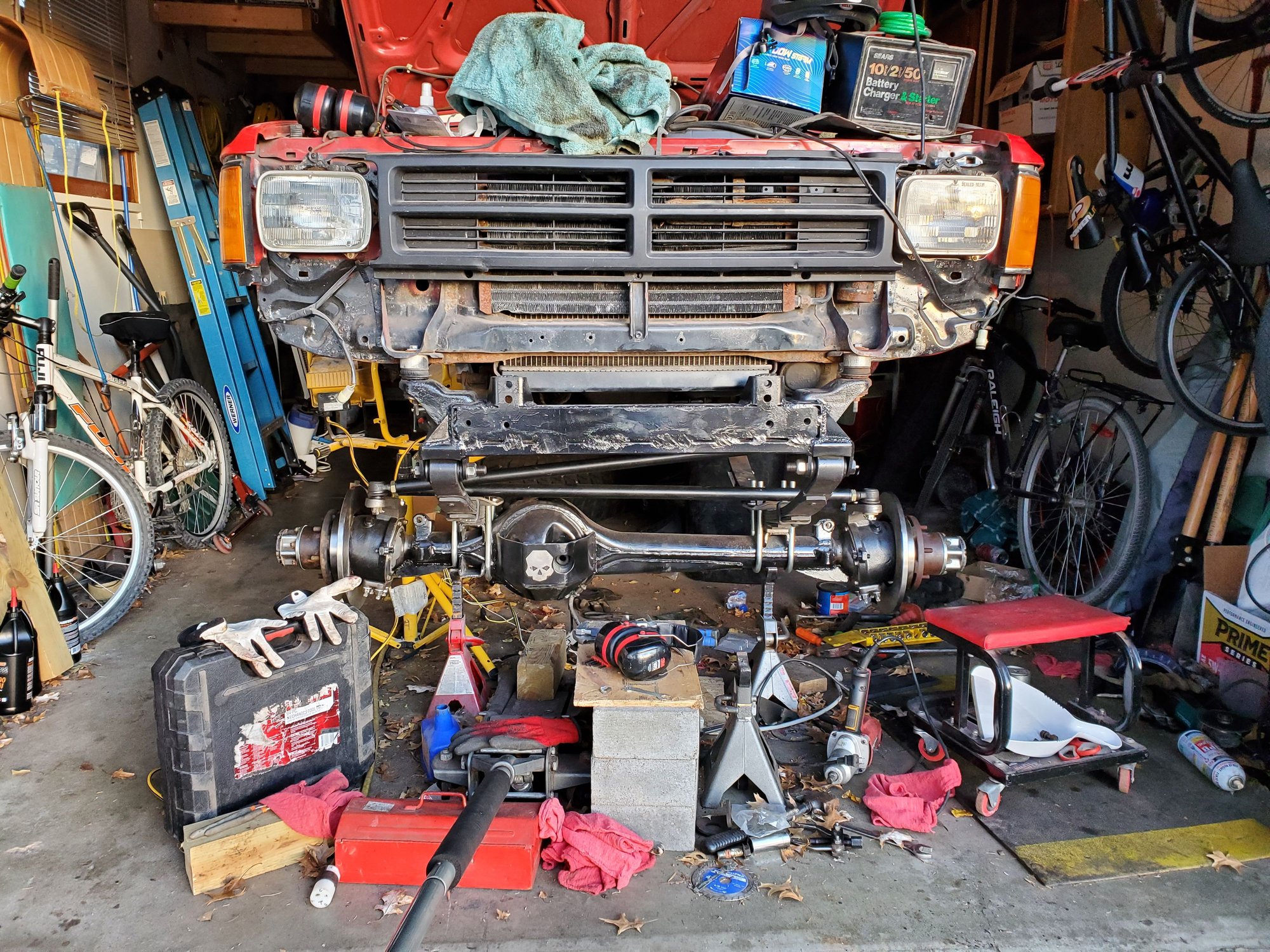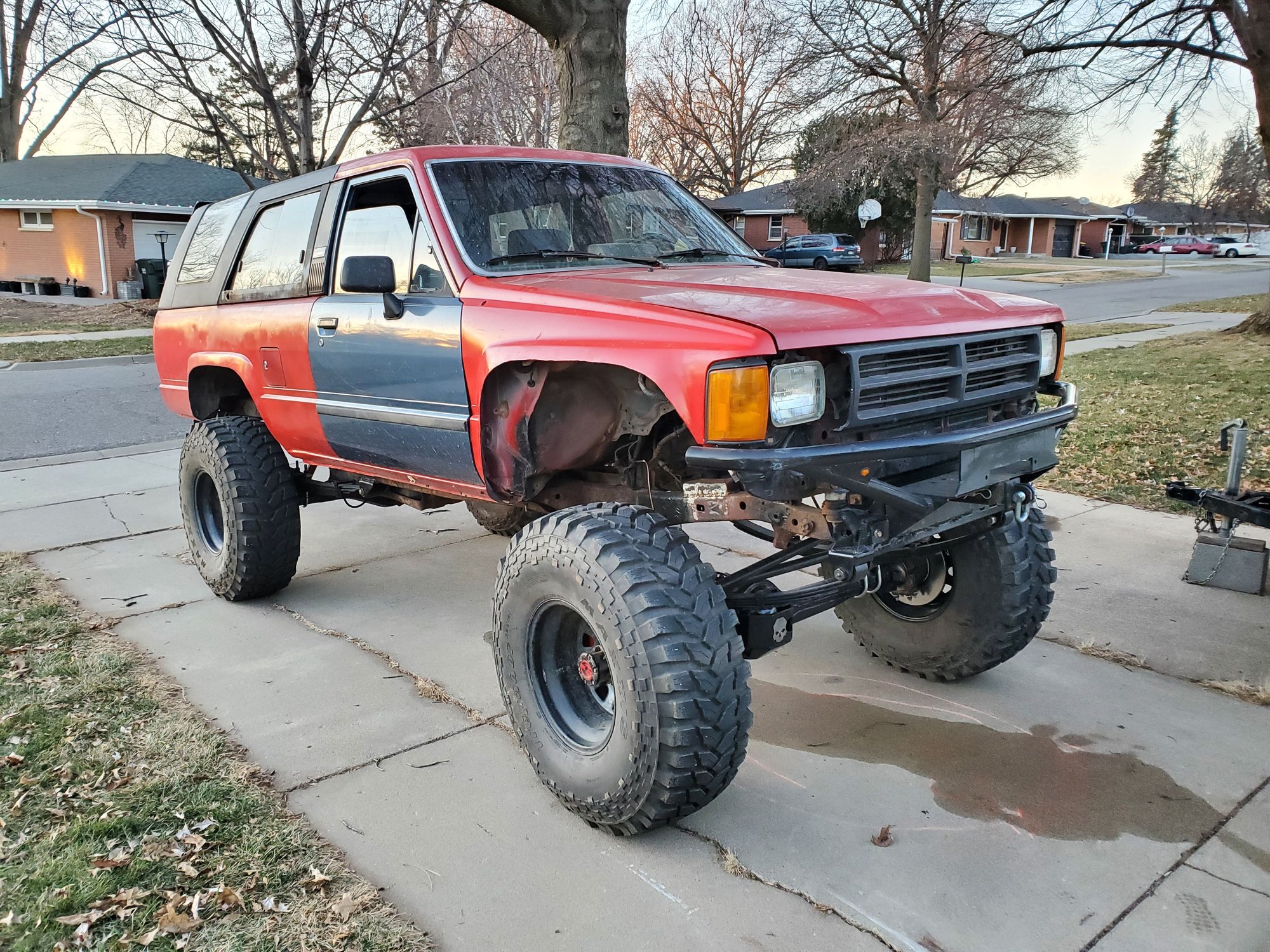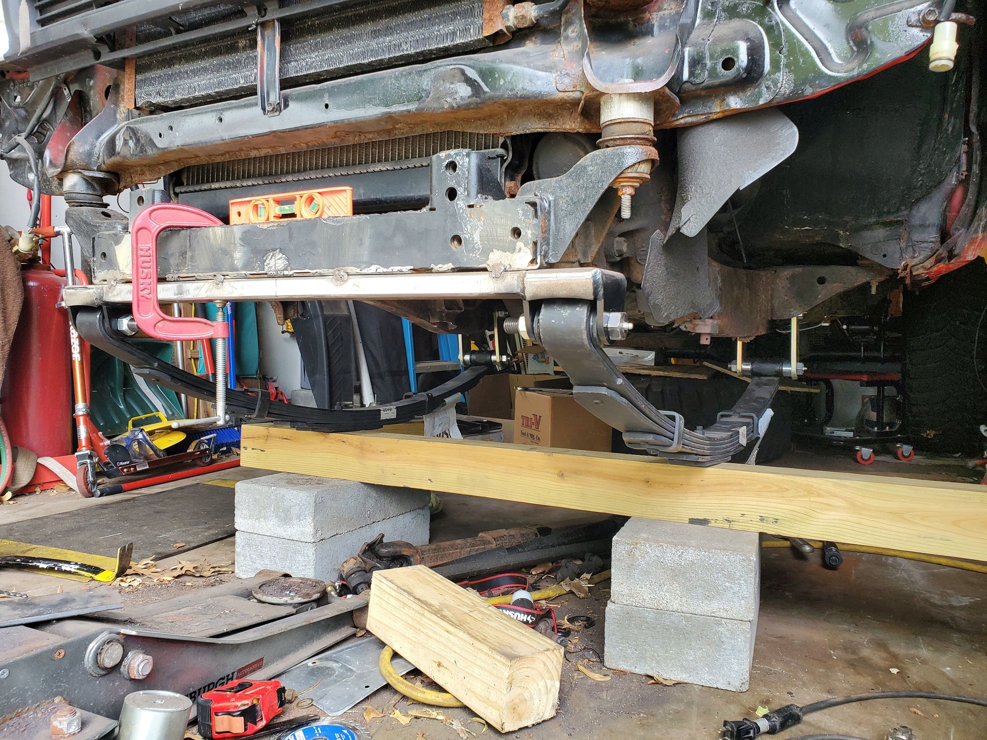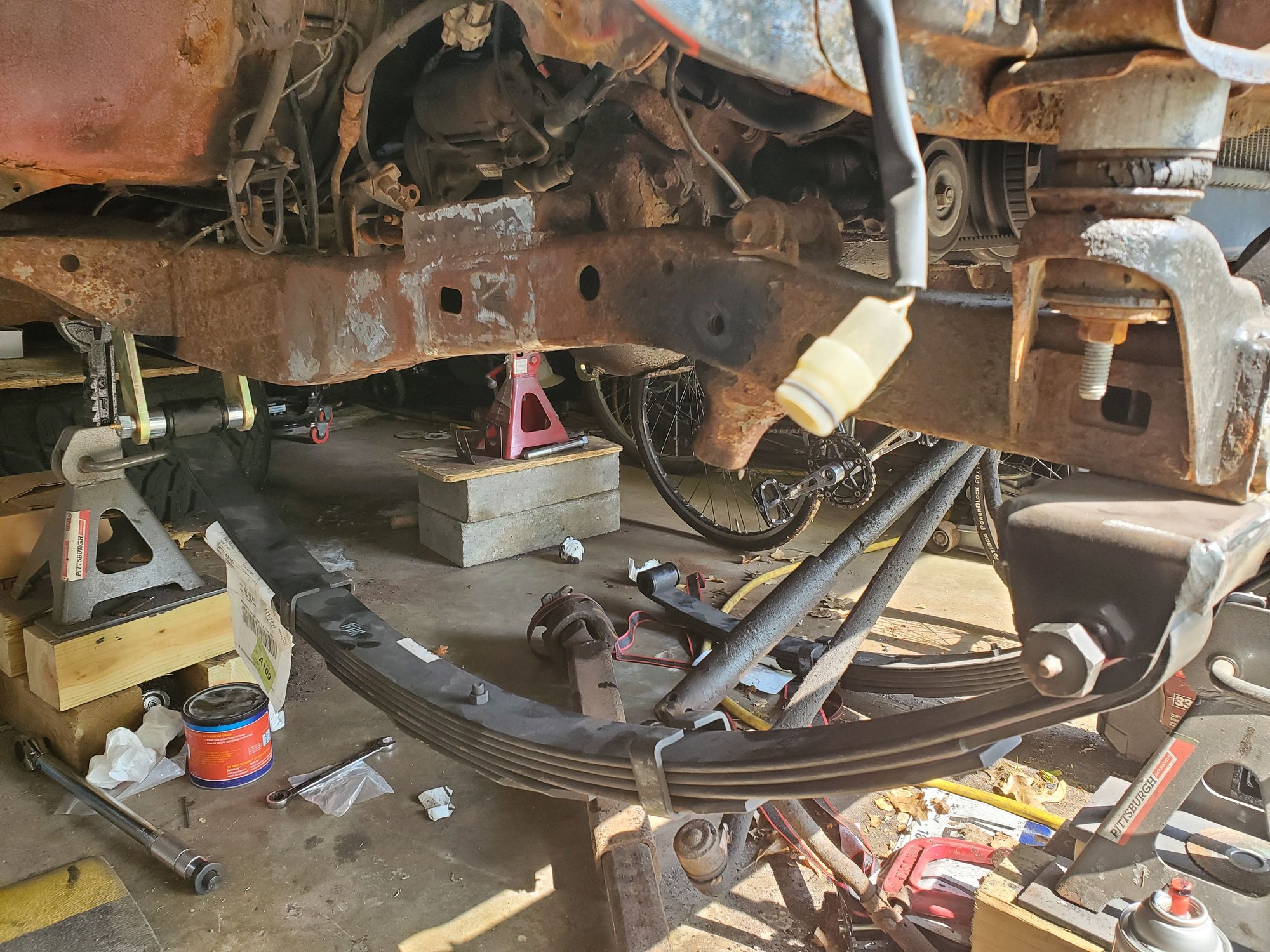I've got to do some little stuff, but also going to do the chevy swap too before I drive it. Currently I have a broken leaf spring. Will look into possible Chevy spring under... we'll see how it sits. Needs an alignment too. Death wobble at like 40mph. So that's what's goin on!