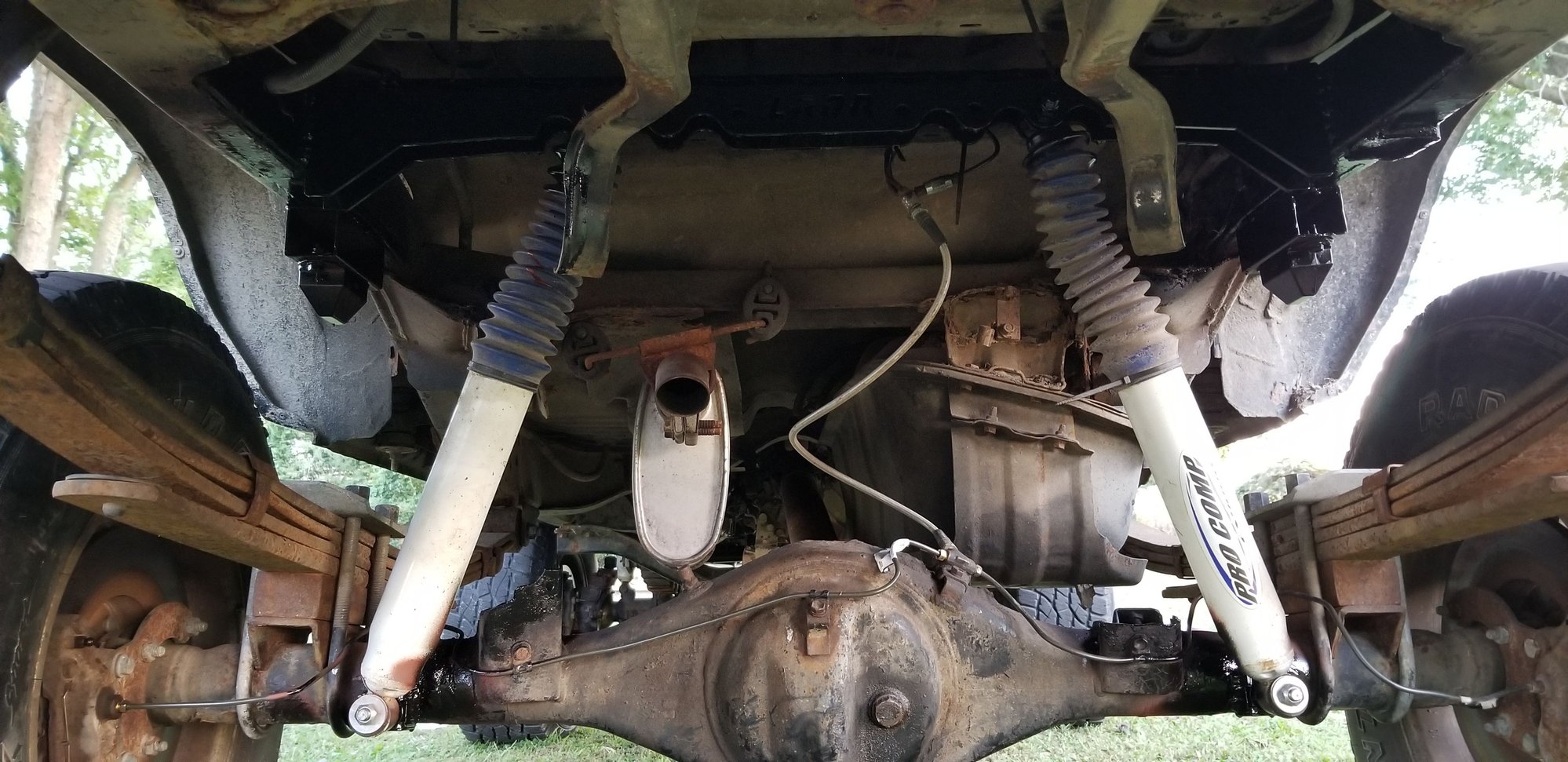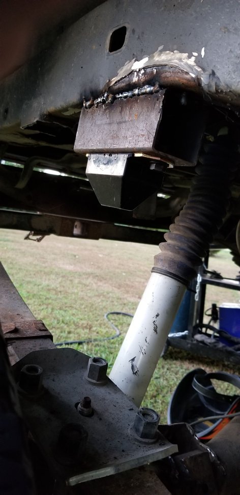 I used Lowrange offroad shock mounts on the front and back. The rear ones said they would need cut to fit in the description, but they ended up 1/8 in short. I split the difference and was able to make the weld. It was just a little more tricky since it wouldn't hold itself up. The shocks are nearly vertical. And they work much better. This picture was also taken before my brake routing was done. I also broke a line and had to replace it. The lower shock mounts are lowrange mounts as well. They get pretty low on the axle and buy you 4 or 5 more inches of shock length.