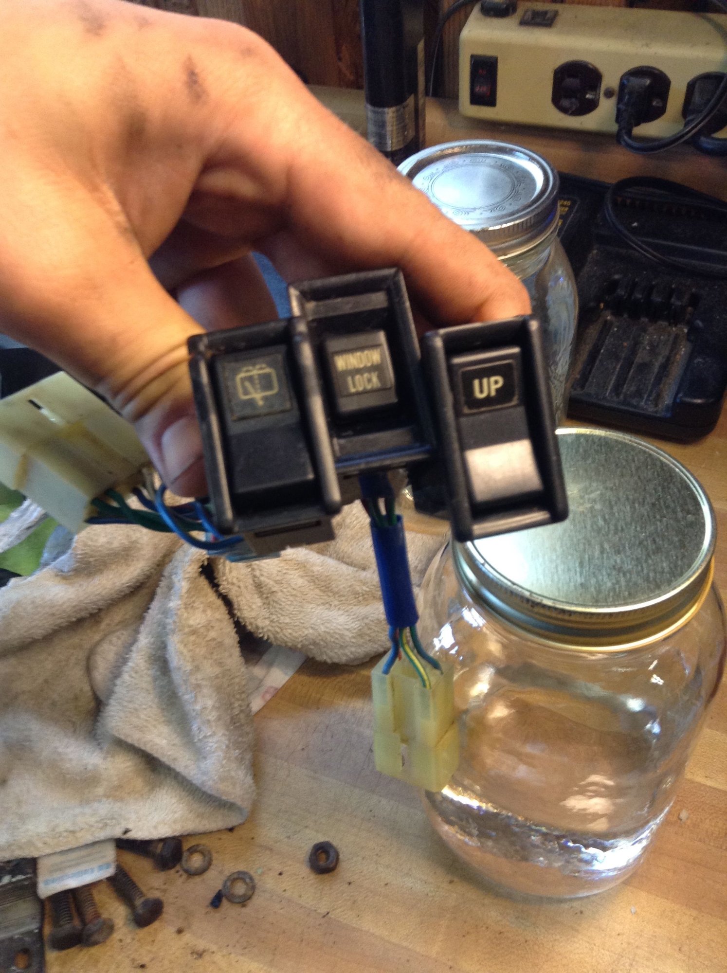 We tied in the window lock to the switch. The windshield wiper and sprayer will be a project for another day....or maybe week depending on how botched that is.