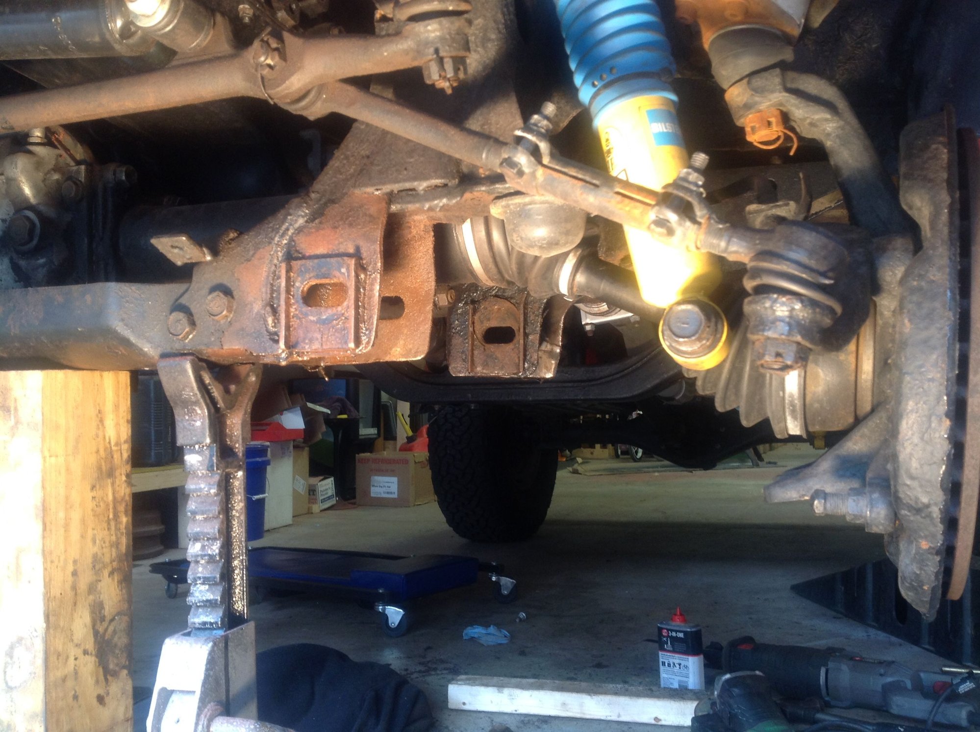 The control arm then just swung down (with some effort) and I was able to get the saws all blade in there. If anyone reading this is getting ready to do this do yourself a favor and buy some good quality blades. In total I used five Lenox carbide blades to cut two bolts out. It wasn't too bad sitting and cutting. Use lots of oil and try to get the blade between the frame and the bushing- less to cut.
