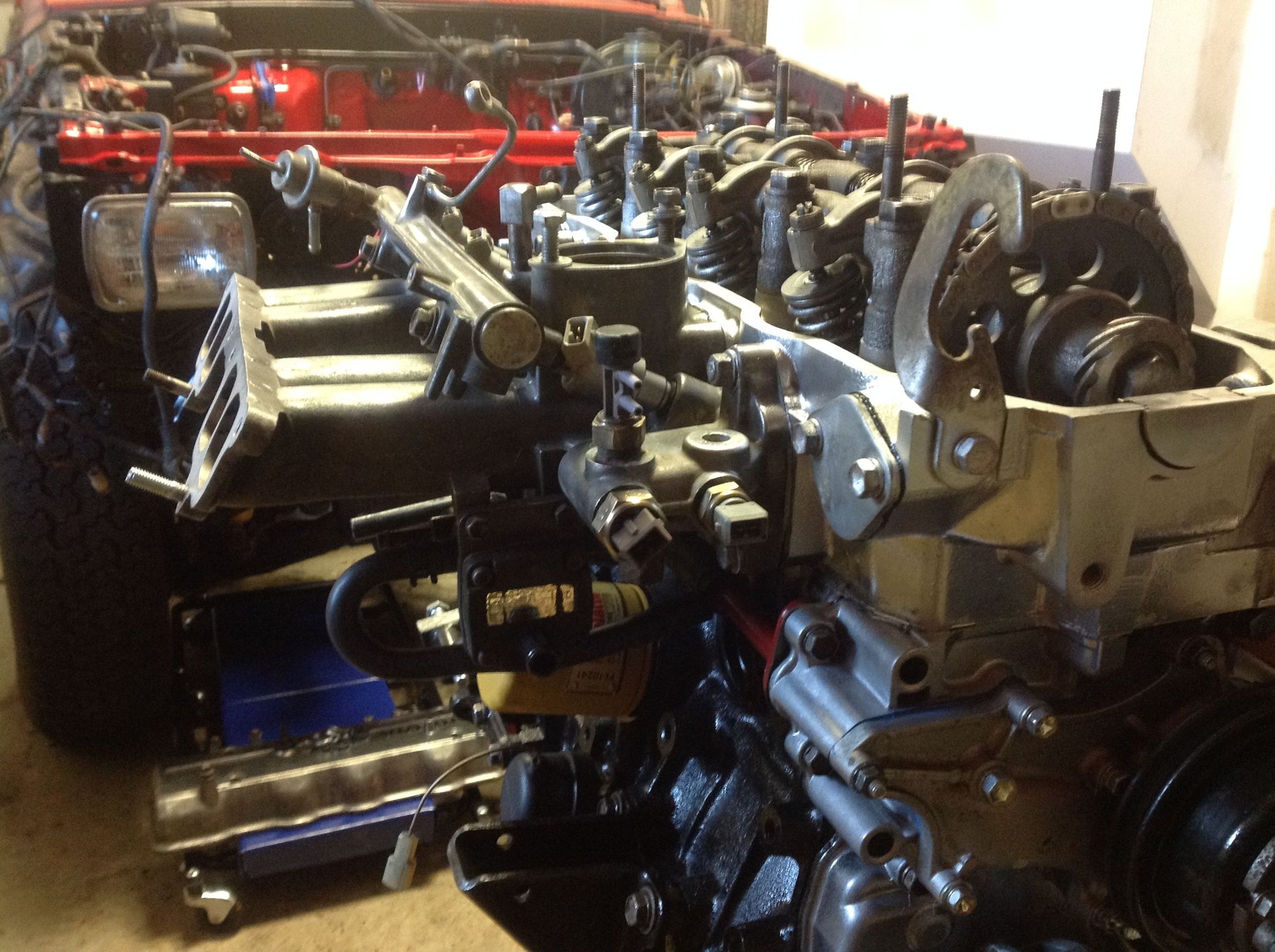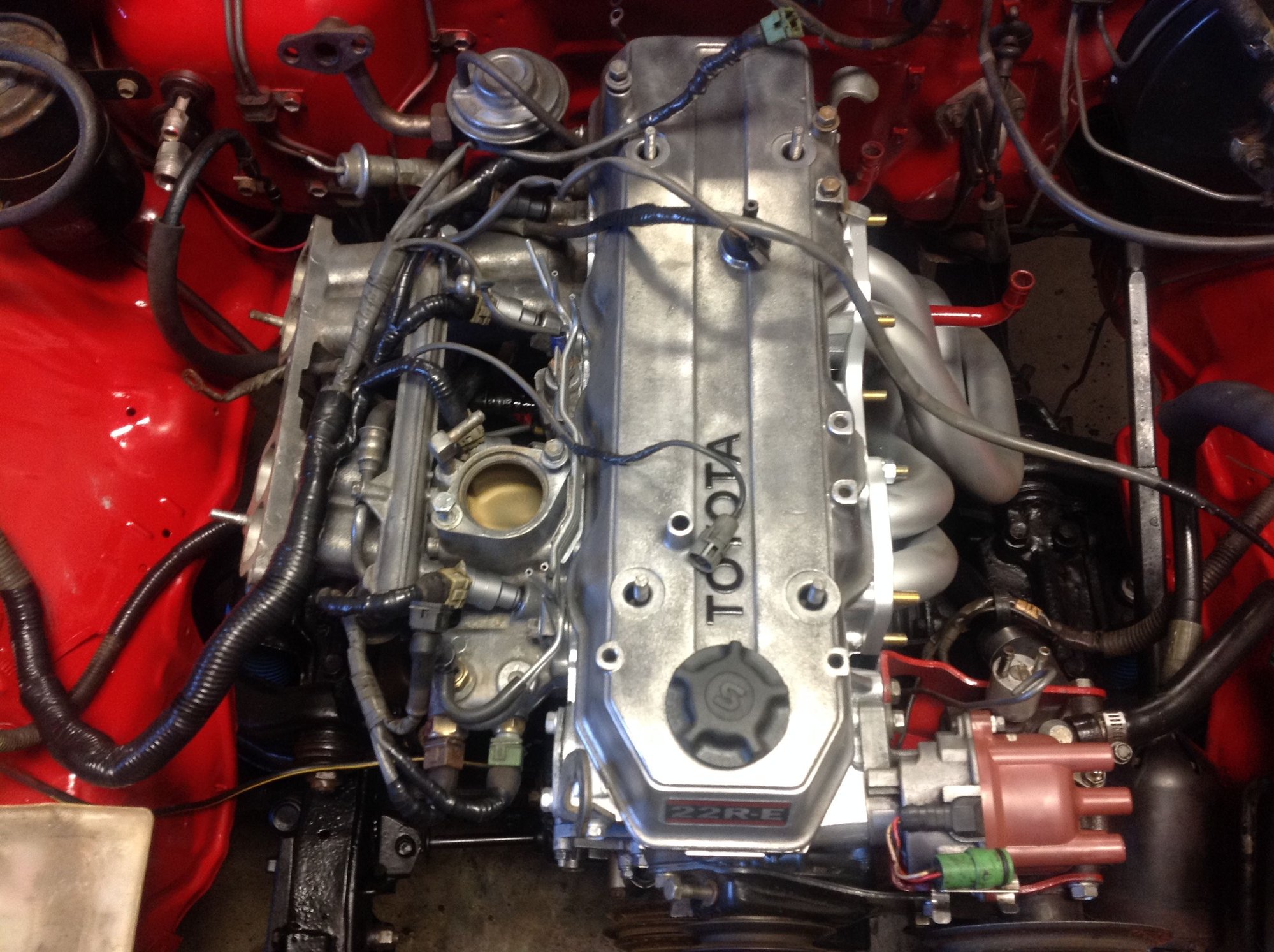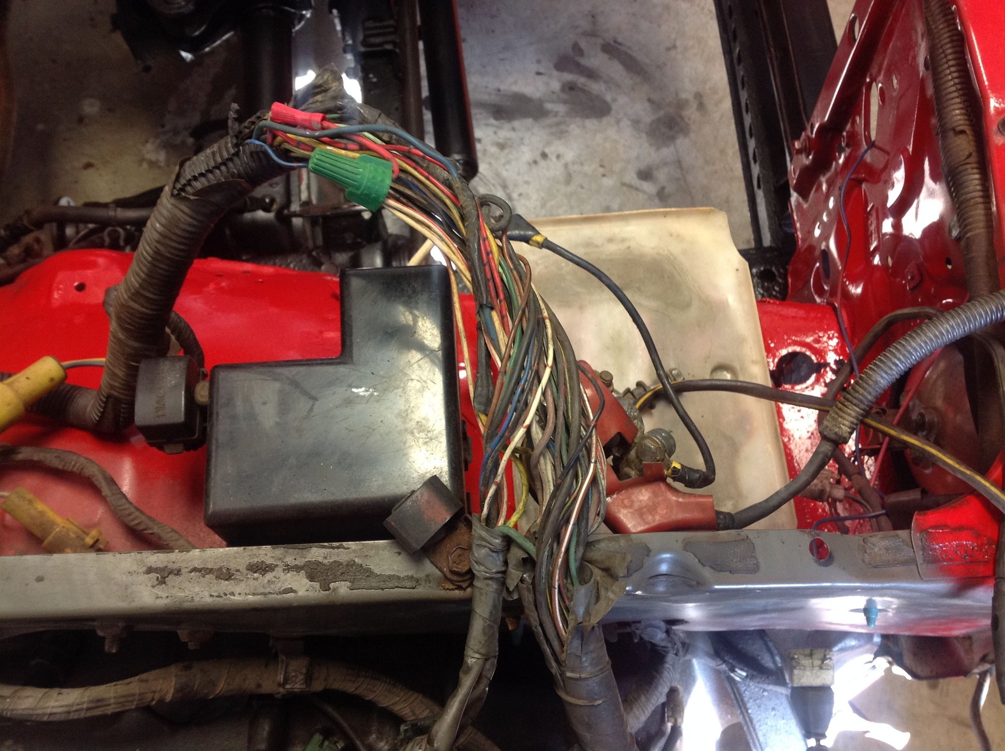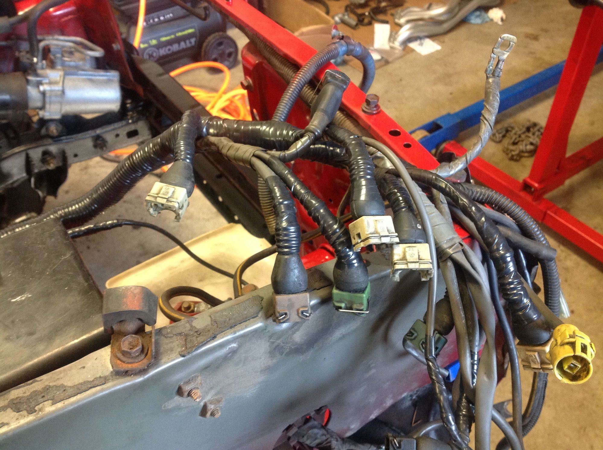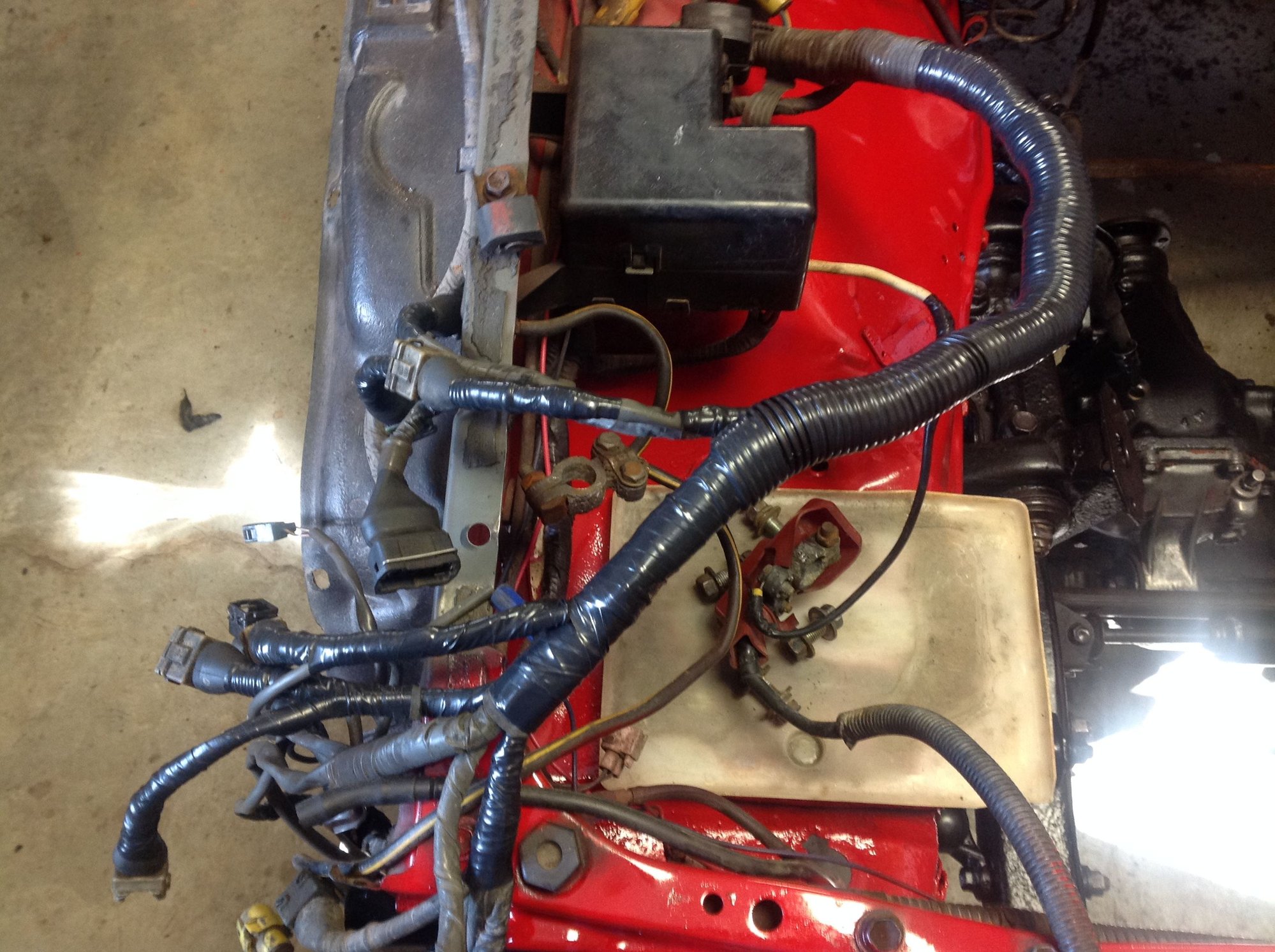 The upper intake isn't bolted up yet. I'll wait until I get the motor in and the wiring harness hooked up. Had to do some repair work to the wiring harness, too. Not sure what is going on- it's cut into and wires cut and swapped- it's ugly, but it was running fine before so I'm just going to clean it up, wrap it up and hope for the best. Saturday is the day the engine is going home!