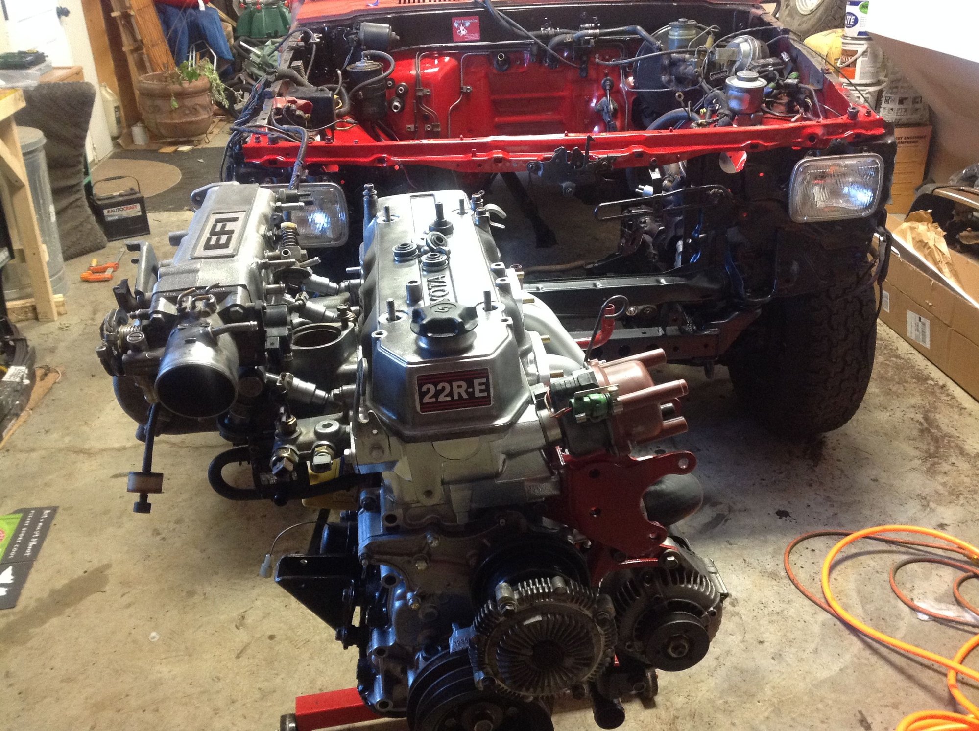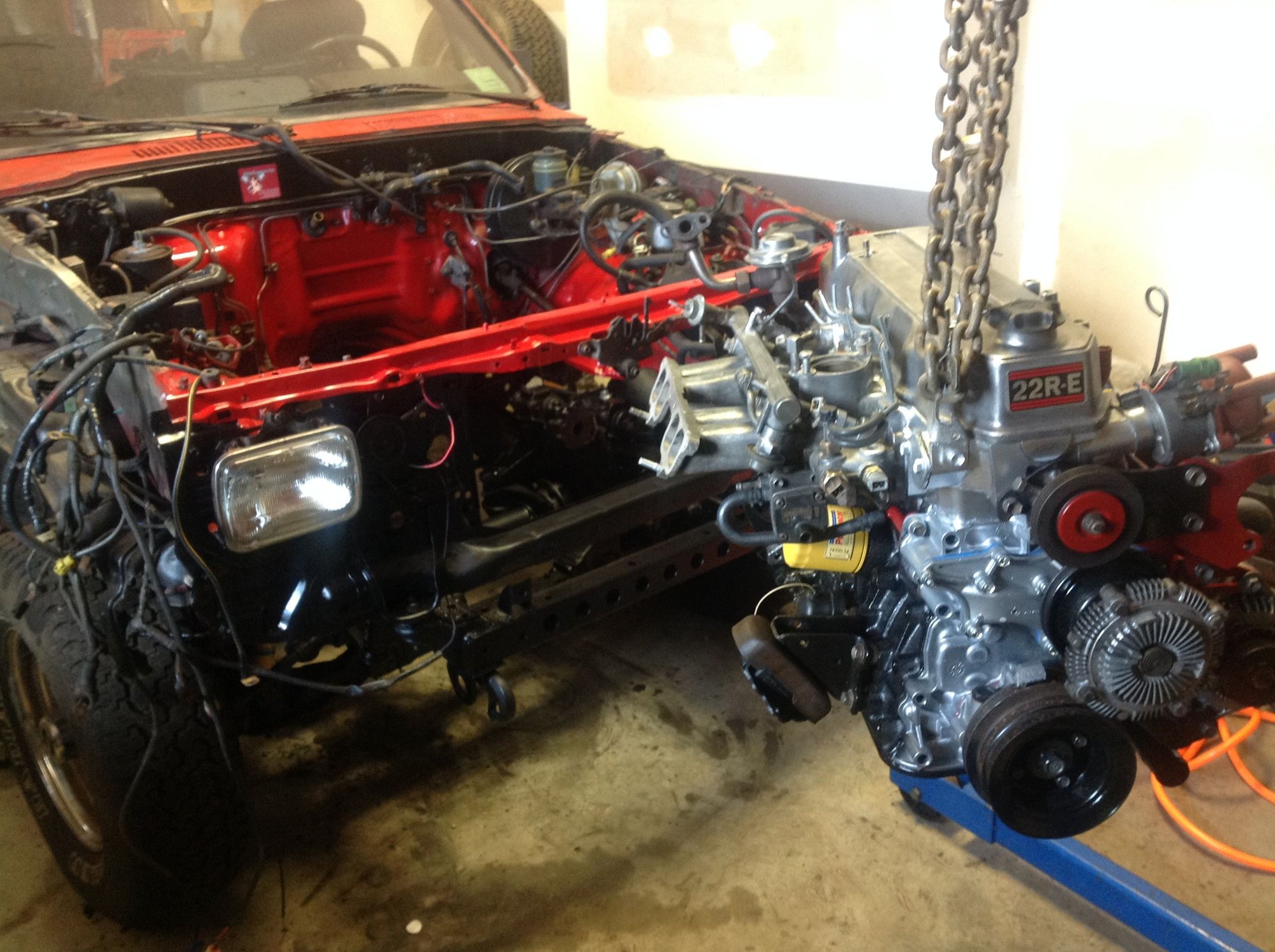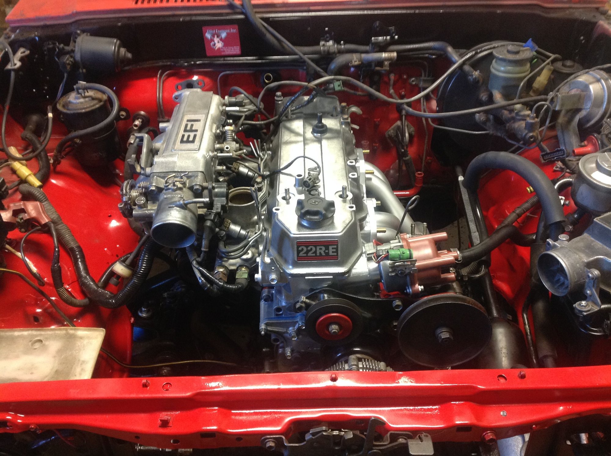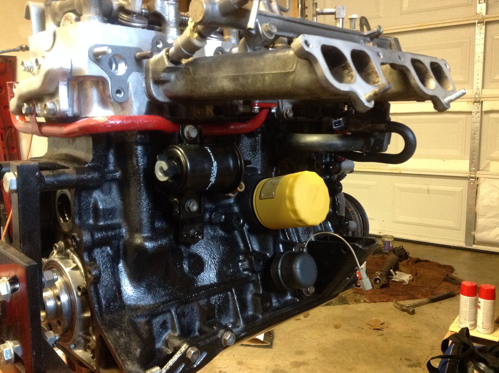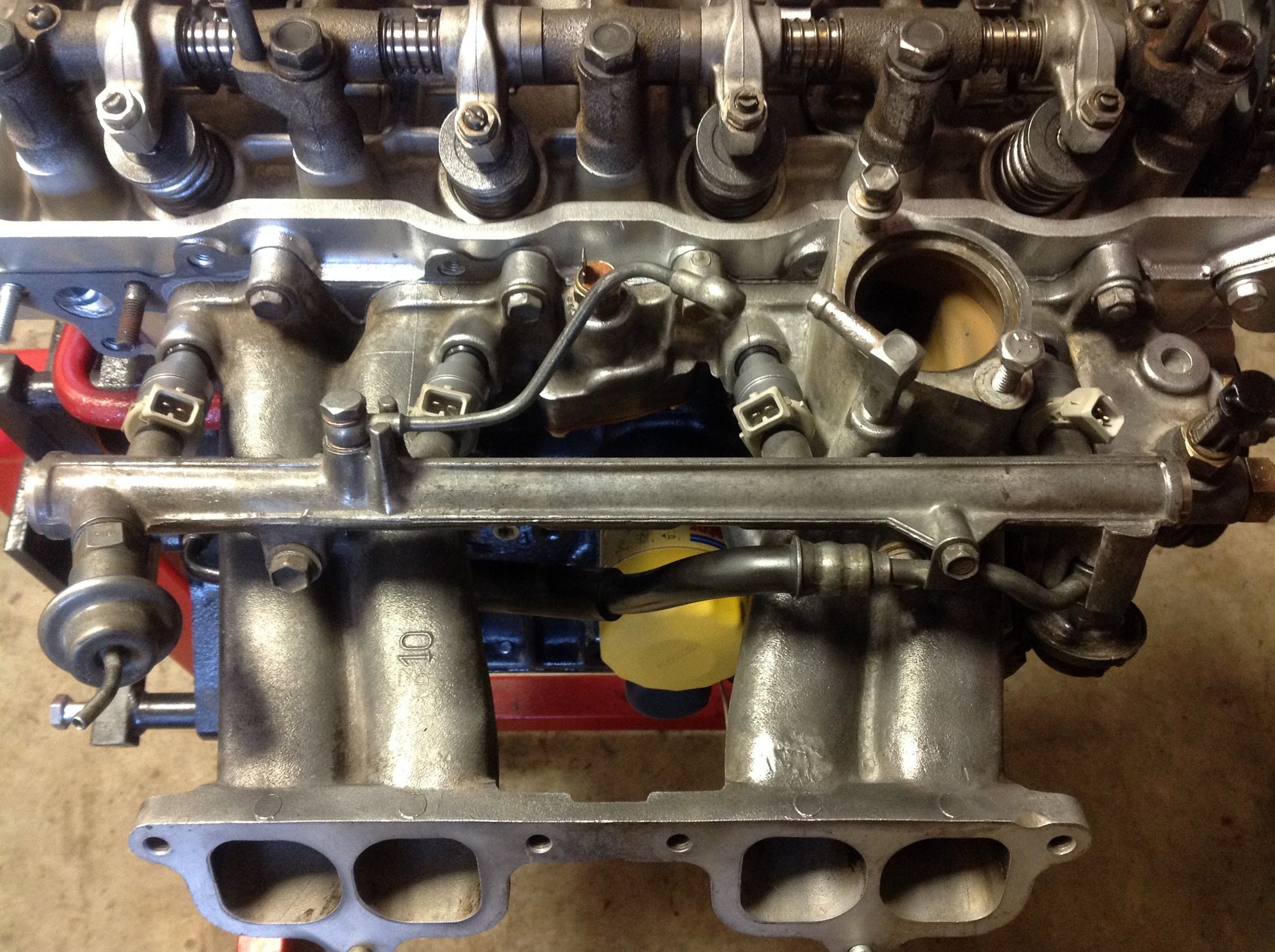 The upper intake isn't bolted up yet. I'll wait until I get the motor in and the wiring harness hooked up. Had to do some repair work to the wiring harness, too. Not sure what is going on- it's cut into and wires cut and swapped- it's ugly, but it was running fine before so I'm just going to clean it up, wrap it up and hope for the best. Saturday is the day the engine is going home!