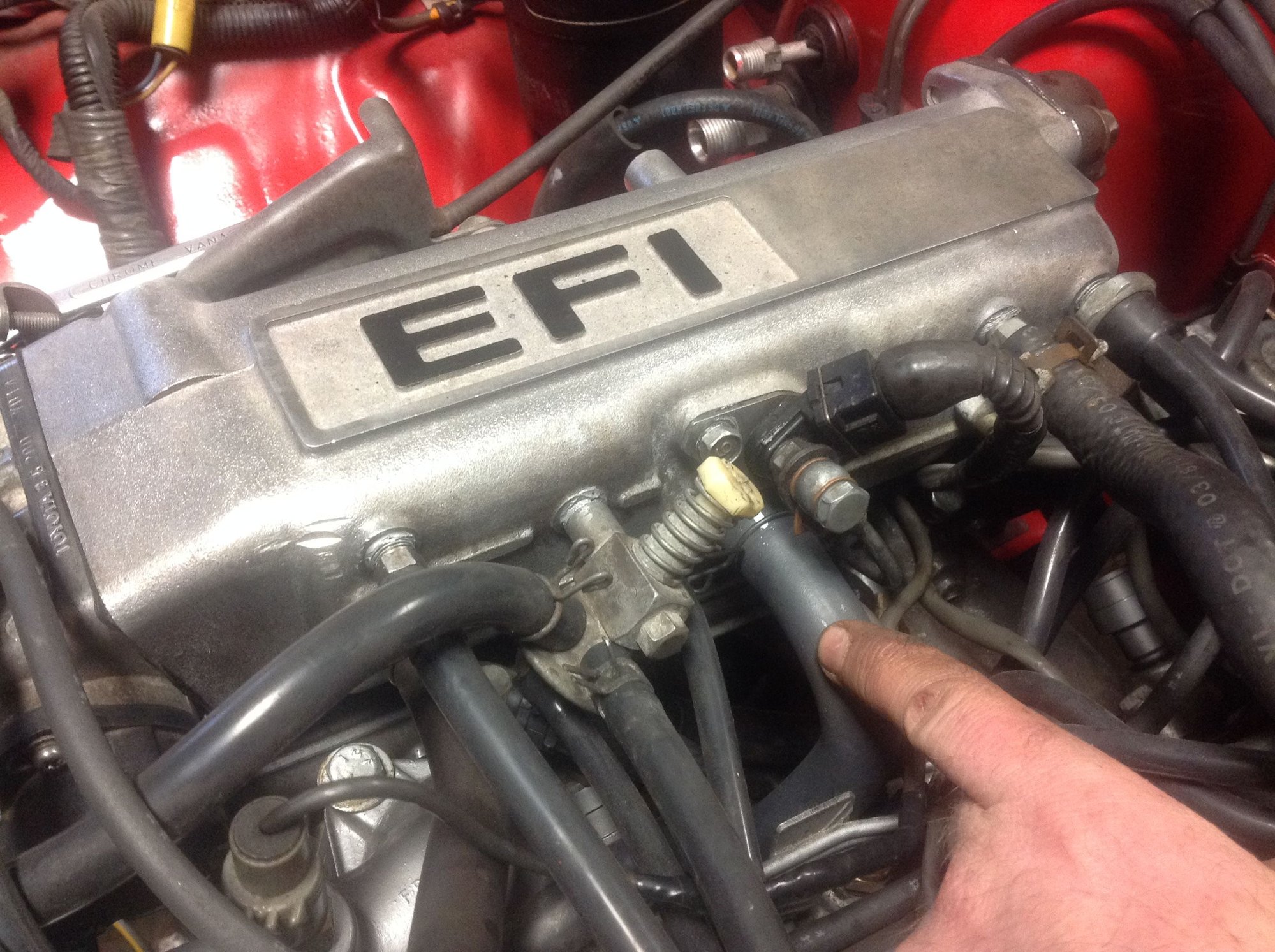 Was hooked to the elbow fitting that pops out of the bottom of the intake, just behind the coolant temp sensors.