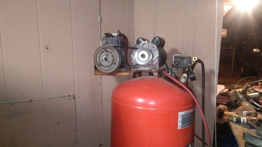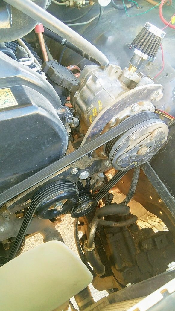 As of right now this is how things sit. The compressor works awesome.I raise the rpm a little and air up the tires as quick as a tank would. Its almost dead silent. The best part after buying the belt, pulley, brass and other odds and ends it cost about $120 so it was cheap. And its certtainly unique. One thing I considerd when making this is if it ever gets a super charger. I made it so I can easily add another idler pulley to the left of the compressor and change to a longer belt and a supercharger should still run no problem.