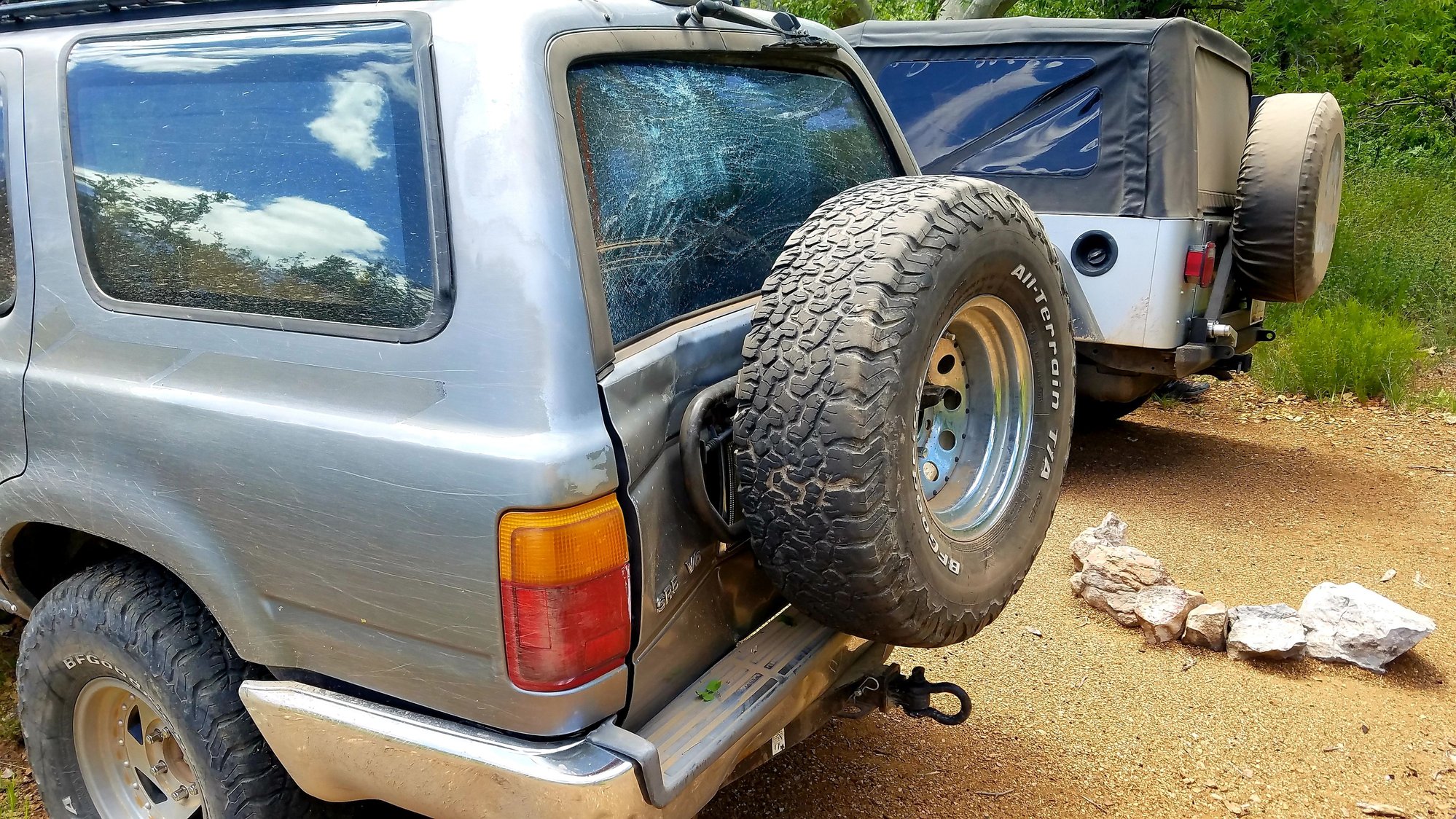 The tire carrier handled the hit fine. It slightly bent the mounting plate back just a bit but nothing a few good whacks with a hammer couldn't fix. The tailgate really took the majority of the hit.