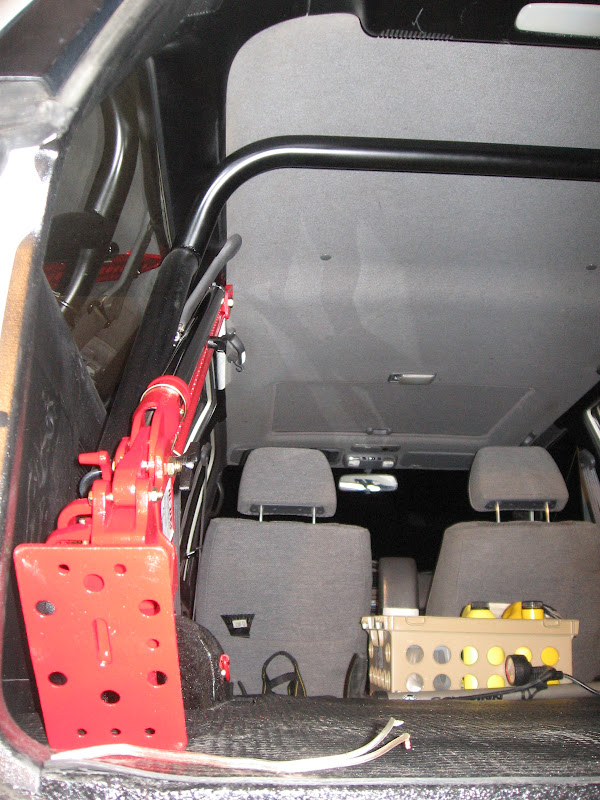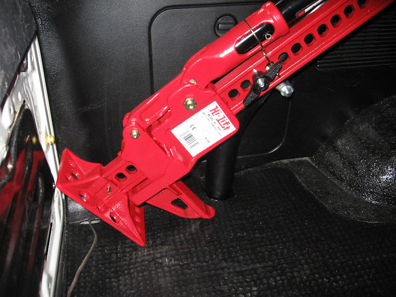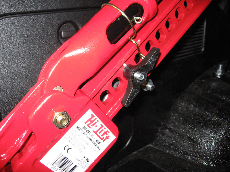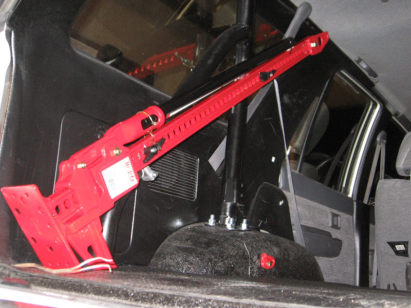 I used 4Crawlers idea of mounting the jack to the roll cage but went a different route with the hardware to mount it. I used a long U-Bolt and then a plate from a 2" exhaust clamp. Cut off one side of the long U-Bolt and then screwed on a twist handle and it turned out awesome!