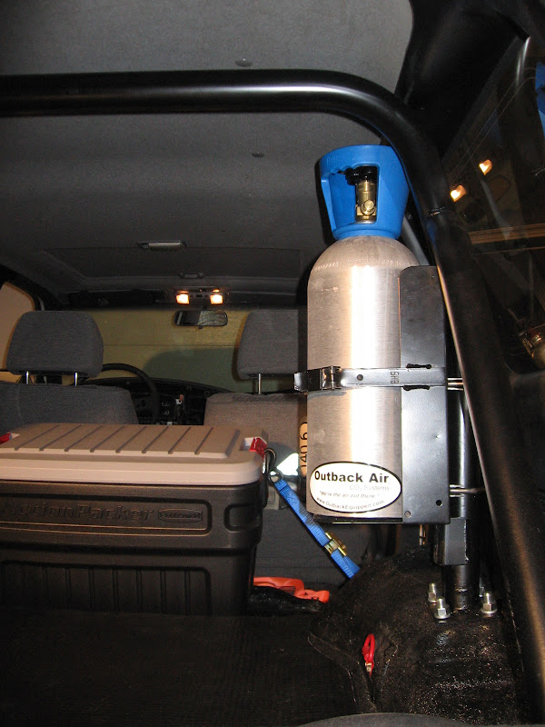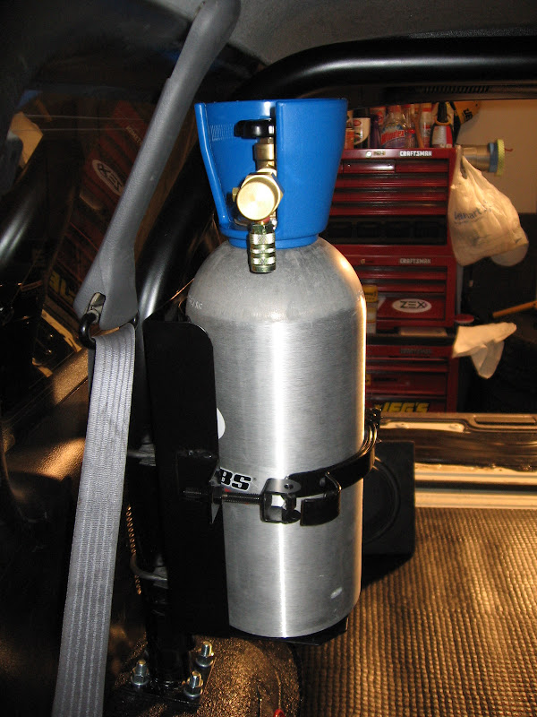 I used the 1st Gen Roll bar to mount the tank in the vertical position using a heavy duty fire extinguisher vehicle mount. I went this route for a few different reasons, one its takes no tools to remove the tank from the bracket and I can have the bottle out in about 2 seconds. Its a very secure solid bracket that will not turn the co2 bottle into a deadly missile in the event of a collision. The bracket can also be locked using a pad lock if I ever decide to mount the bottle outside of the runner.