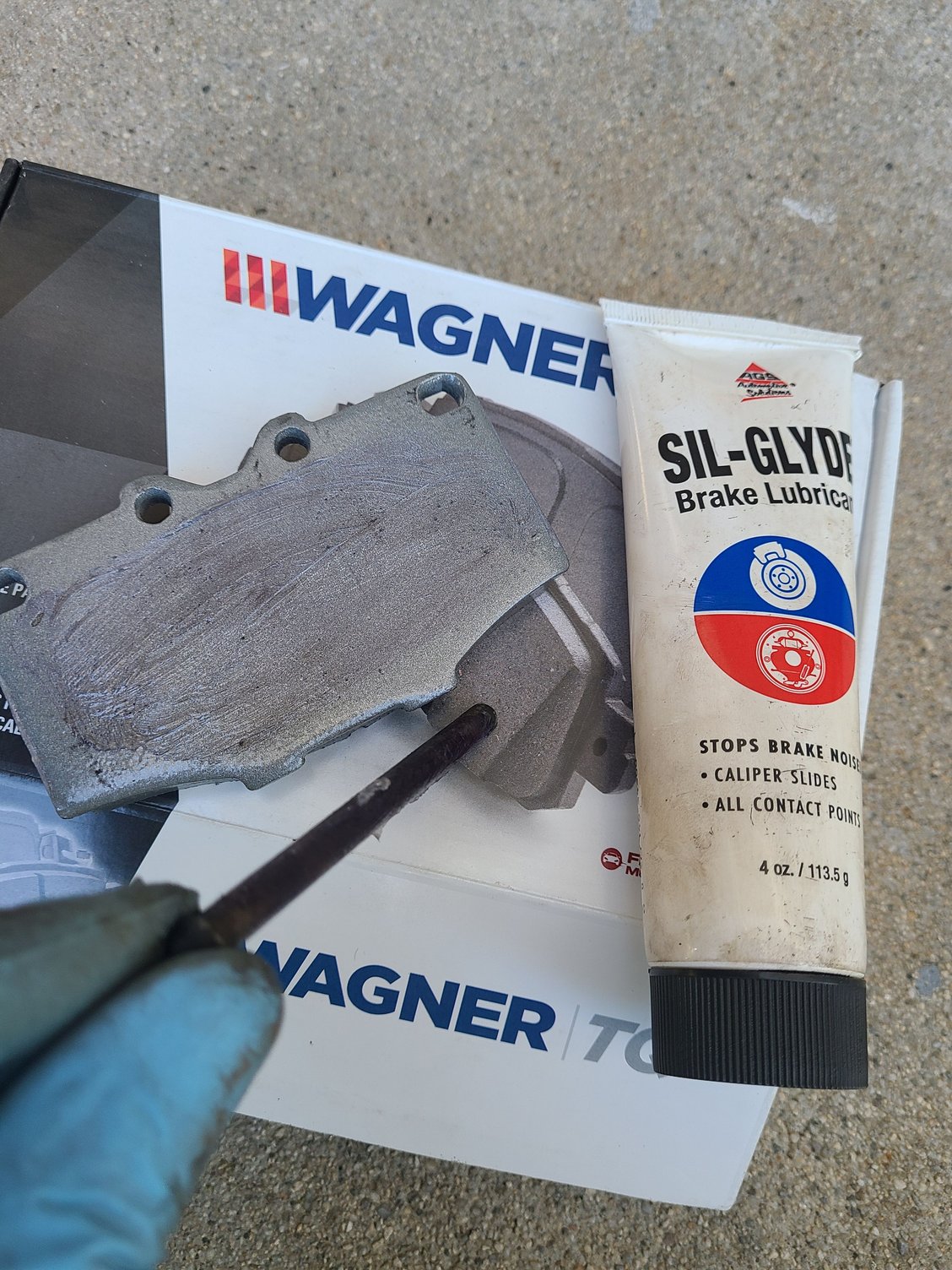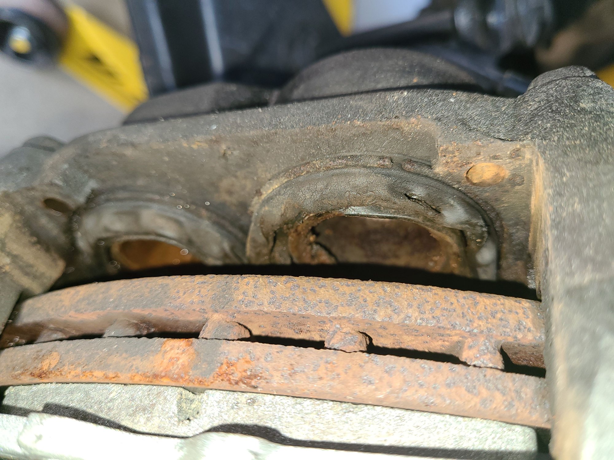 The brakes in this truck were horrible, despite the seller stating that "the brakes are great". So I bought some Wagner ThermoQuiet pads and installed them. The seller apparently did not believe in lubricating brake hardware. The pins and pads were completely dry and rusty. With most of my tools packed up for the move, I did the best I could to remove the rust and apply some lube to the pads and the pins. The caliper dust seal looked very suspect, so I'll probably replace them down the line, after the move.