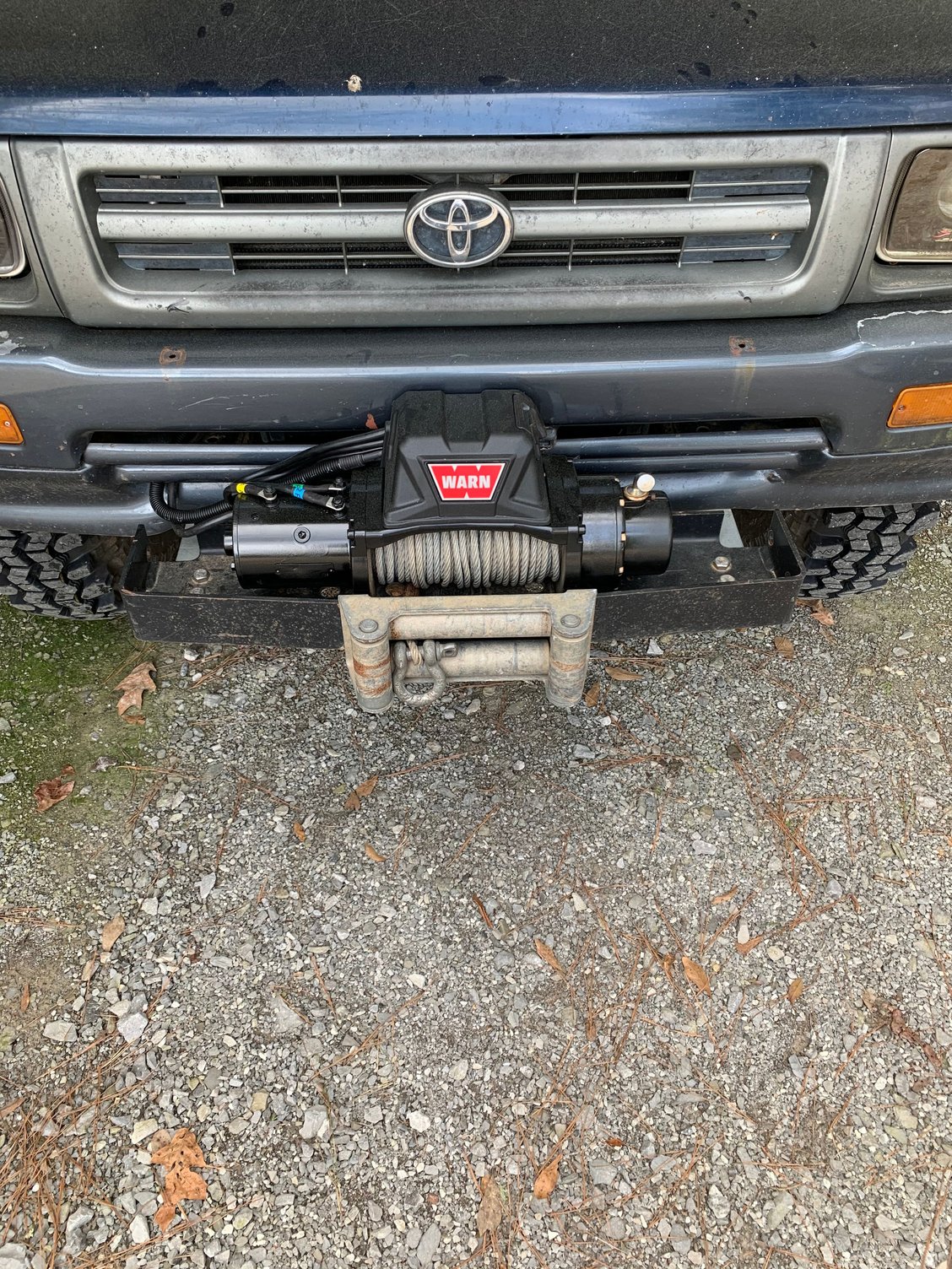 Winch mounting is just some 3” or maybe 4” galvanized angle i had laying around. Its like 1/4-3/8 thick, plenty strong, mounted into the factory tie down and tow hook holes.