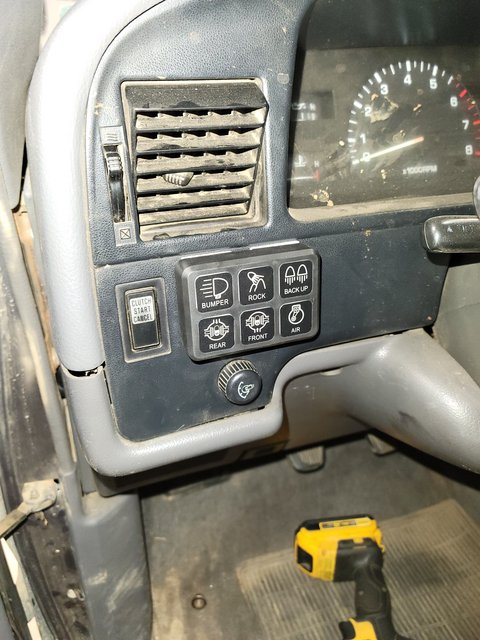 And finished up my aux switches and wiring the lights. My air compressor is on backorder, so that didn't get installed. Air lockers will be happening in the future, but I got the switches all set up for them. But my bumper lights, rock lights, and back-up lights are functional.