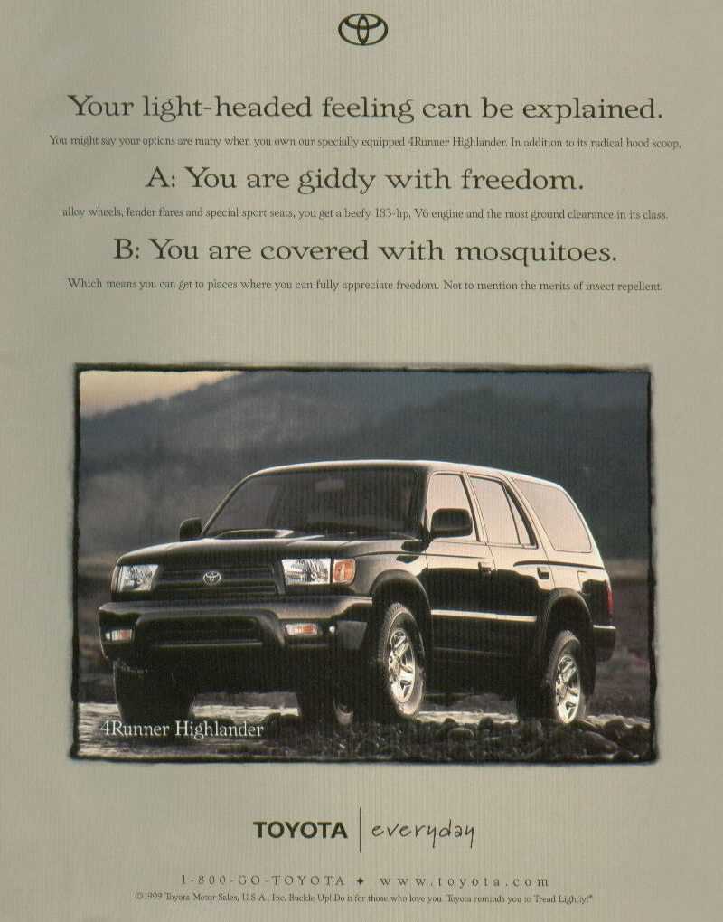 I used to have that ad poster, and the movie poster from Back To The Future hanging in the garage, both of which I got from the dealership. The movie poster the dealership had had the Toyota 4x4 on it, not the Delorean that was on the theater poster. I had an 85 Short Bed 4x4, SR5 Black, (which I traded on the Gold 4Runner) and when we saw Back to the Future at the theater I was parked right in front of the exit. Cool when everyone came out and were ooohing and aaahing over this truck - exactly like the one shown at the end of the movie! Then we walked over and got in.... hey, I was like 24 years old, it was a very cool moment! Too bad I left that poster in that garage, I doubt it's still there....