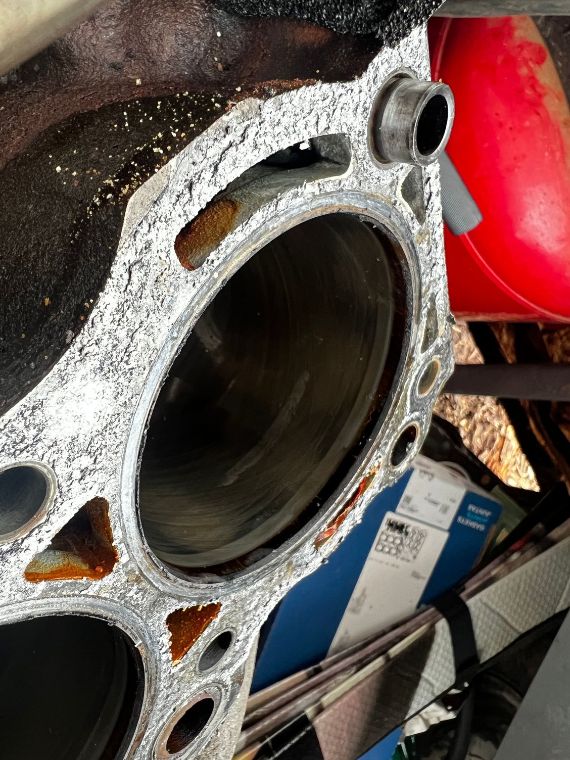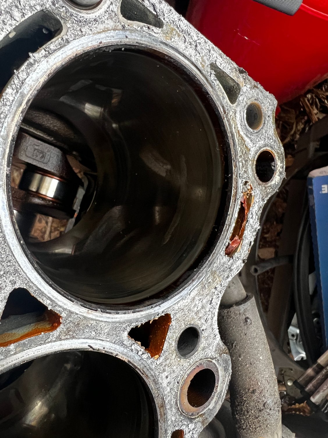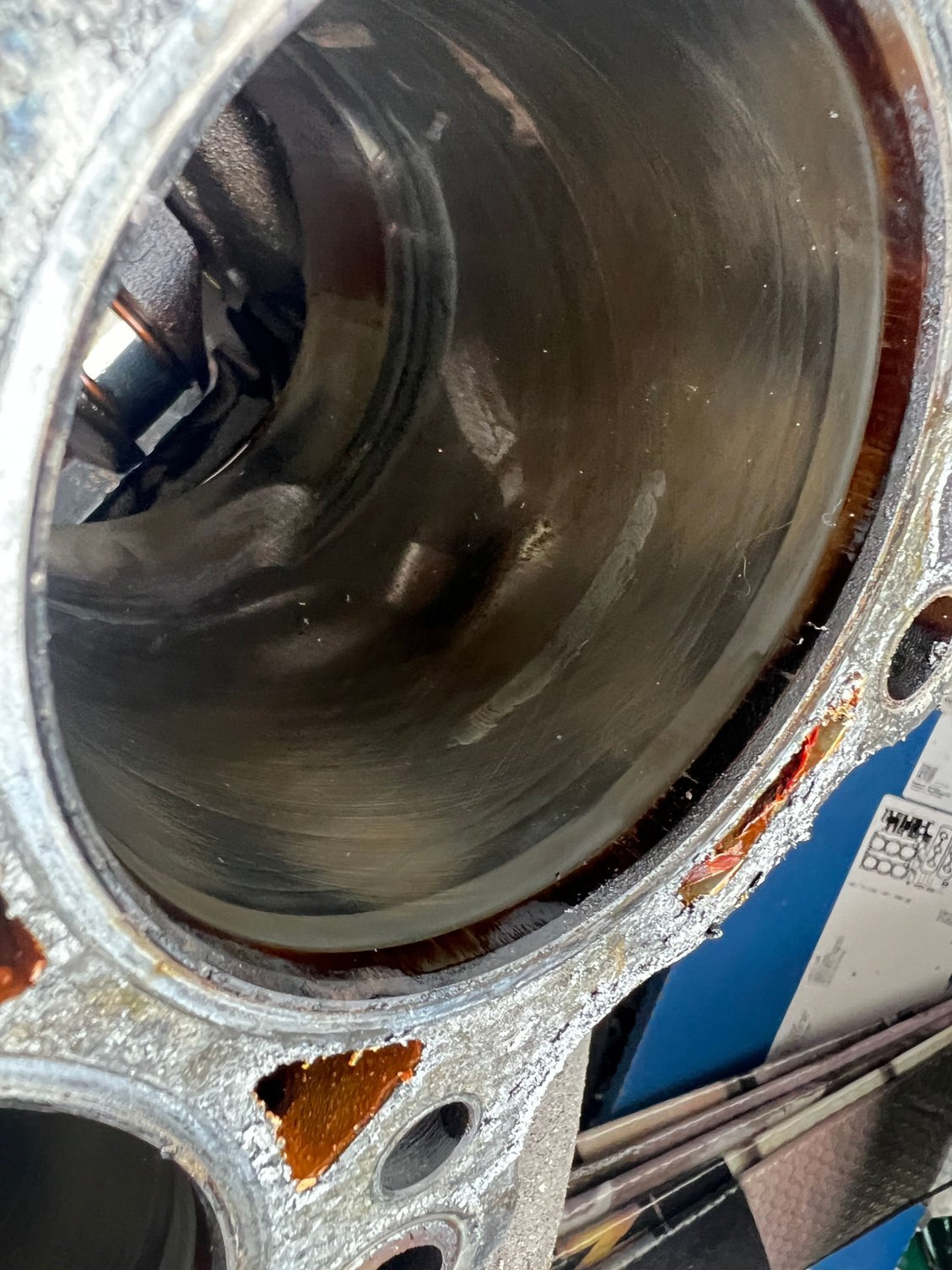 At first I thought you meant the wear ring at the top of the bore, that's common on higher mileage motors. But then that 3rd picture... Def looks like someone welded up a crack and re-honed it.