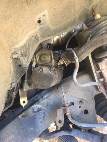 Pulling the starter is fairly easy if you go in thru the right hand wheel well. First break loose the two starter mounting bolts. A 14mm 6point socket with a univeral and 2.5ft worth of extensions does the trick. For the upper bolt run the extensions above the trans support to keep that universal as straight as you can. Disconnect the battery, remove RH wheel & rubber flap. Three bolts hold the brake line in place. Once loosened, move the brake line segment towards the rear of the vehicle. The brake line is wound several times in a coil which allows you to move it several inches without creating any permanent bends. Detach the solenoid and battery cable from the starter. Remove the trans dipstick upper tube, and stuff a rag in the lower tube to keep it clean. Support the forward end of the starter so it won't fall, and remove the two bolts.