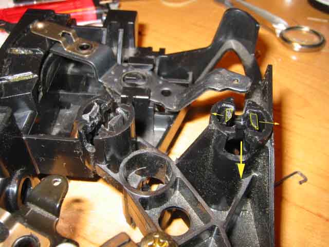 I'm not sure exactly how this thing went in, but here's how I think it worked. It slides in from the bottom, as you can see the rails that it slides in on. There's these two pieces of plastic that run parallel to the rails that have the lockin triangle thing on them. You can get to the one on this side, but not the other because it's in a deep tiny hole.