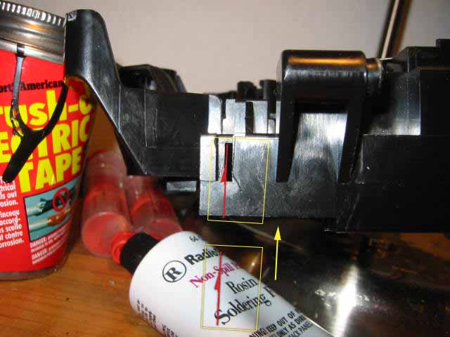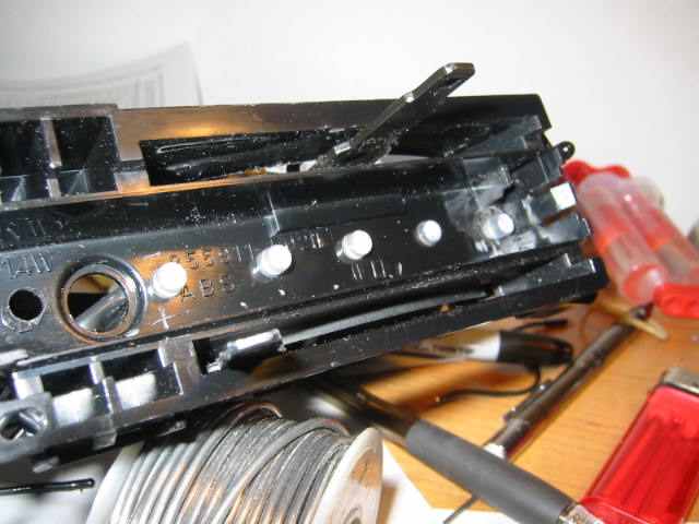 This is a bad picture, but if you look really closely, you can see the resistor. There's a bunch of black gunk all over the resistor and its legs which is some paint on electrical "tape" I borrow from my friend. Well, this picture is mostly to show you the little space on the "outside" of the switch.