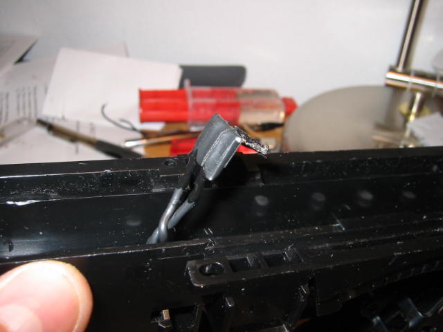 -there's a little grey bulb holder that confused me. I couldn't figure out how the bulb was held in. Ends up there's two thin flaps of plastic on either side that clip into the bulb as it slides in. Actually, the bulb's contacts are soldered to the two metal tabs you see sticking up. Anyway, pull the flaps out, pull the bulb out.