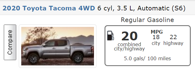 What I see with a lot of people is a negative view of full-size trucks as being wasteful gas hogs. Those same people are at least a bit more ok with, if not completely accepting of small trucks like a Tacoma. When in reality, the difference is minimal. And once you start towing, the full size trucks typically get better mileage than a Tacoma, because they're big & powerful enough to not have to work so hard.