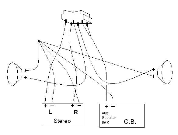 Get a DPDT switch from Radio Shack and tie the +'s and -'s to one set of contacts from CB and the +'s and -'s from the stereo to the other. Of course run the wires from the common on the switch to the speakers.This will switch the speakers from stereo to CB. Works great I already did the same thing.